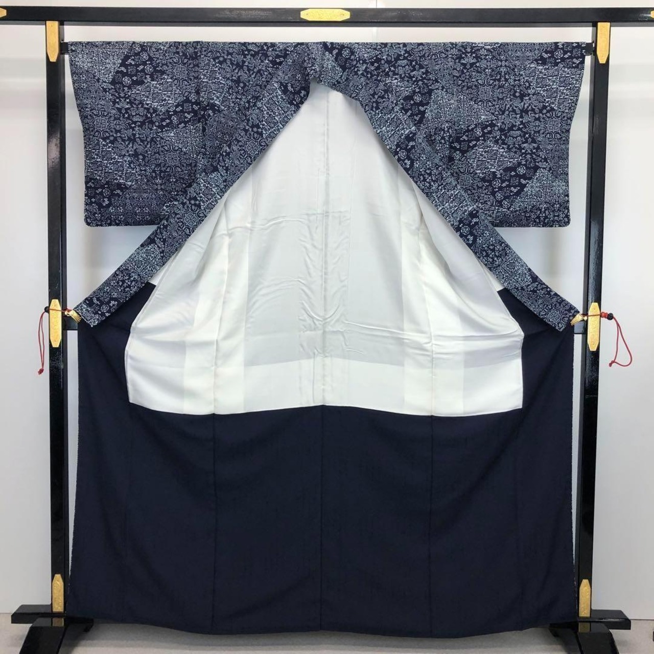天然藍染美しい藍色、鳥や花草模様の寄せ柄模様がデザインされた素敵な柄裄の雰囲気の良いお品でございます。