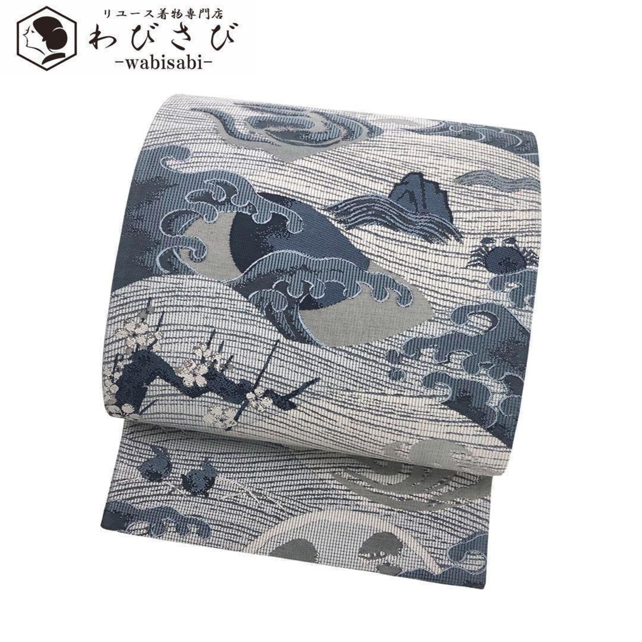 袋帯 本藍染糸織 藍染苑 波模様 梅と松 蟹 白縹色 ガード加工 O-3455