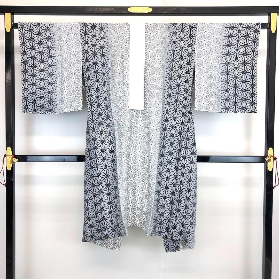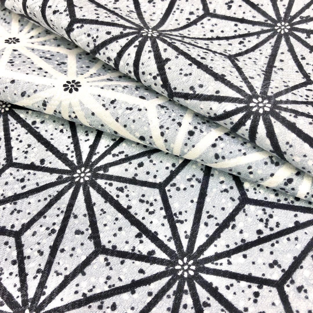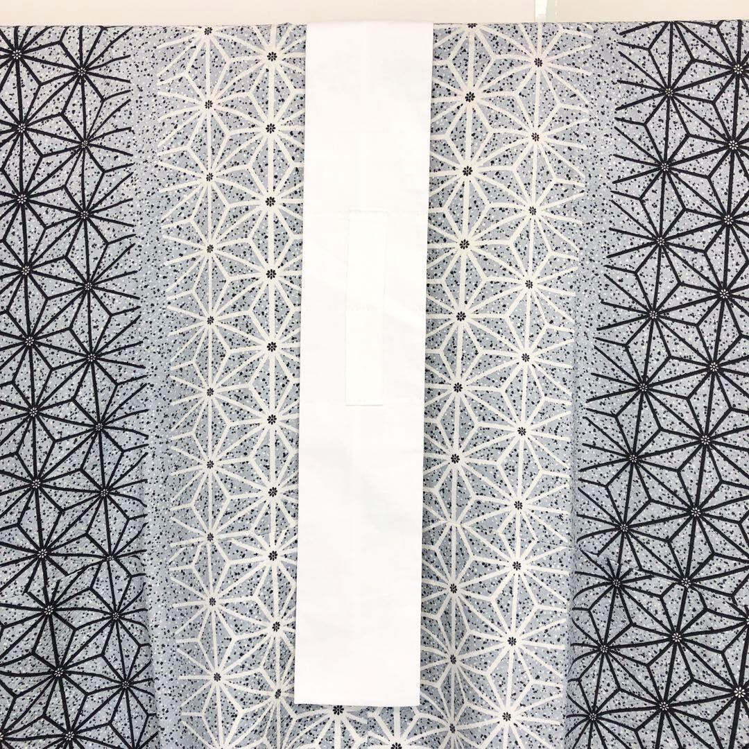 白銅色ベースのモノトーンのグラデーション、麻の葉模様がデザインされた素敵な柄裄のお品でございます。