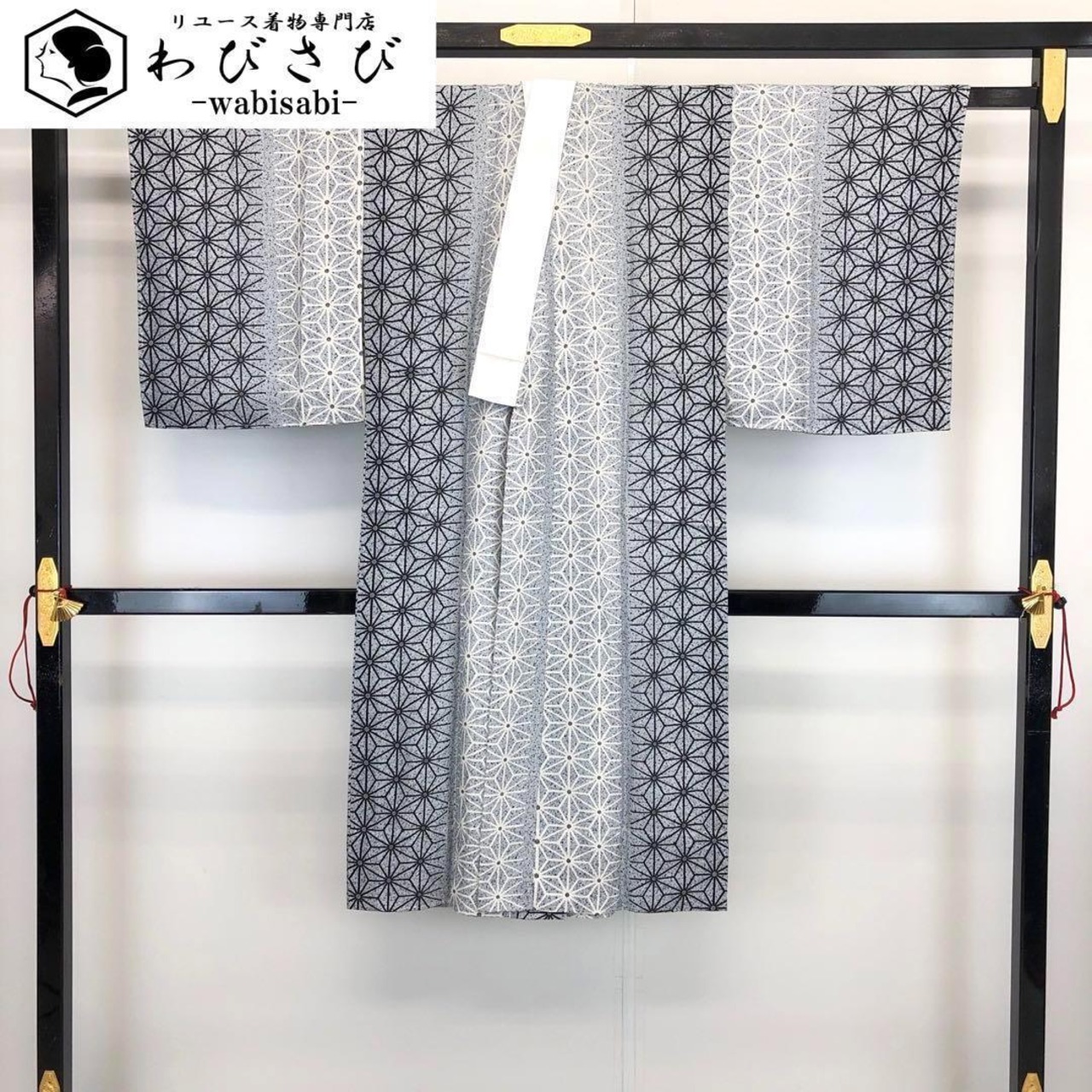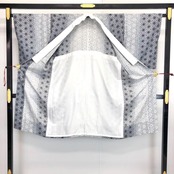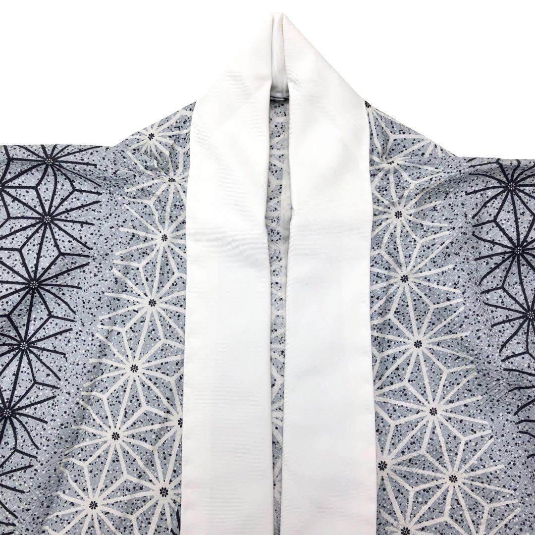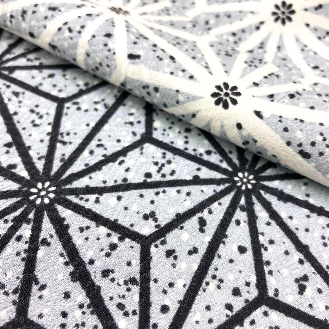白銅色ベースのモノトーンのグラデーション、麻の葉模様がデザインされた素敵な柄裄のお品でございます。