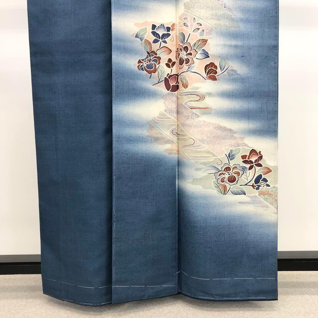 付下げ 品のある花柄模様 暈し 紬 青黛色 しつけ糸 K-3541 着物 きもの kimono 和服 和装 中古 リサイクル着物 【送料無料】