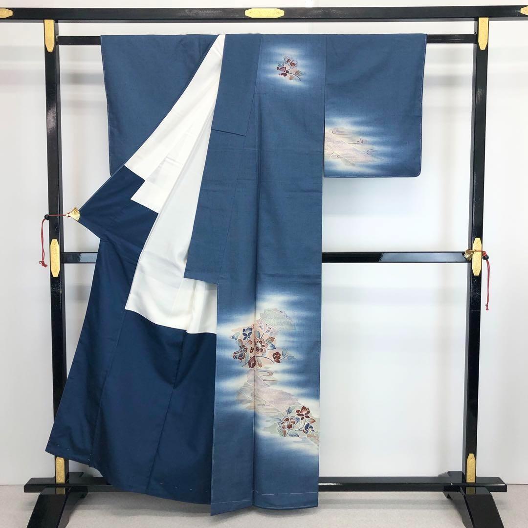 青黛色の落ち着きのある青味のお色の紬、霞模様のような暈しに品のある花柄模様がデザインされた素敵なお品でございます。