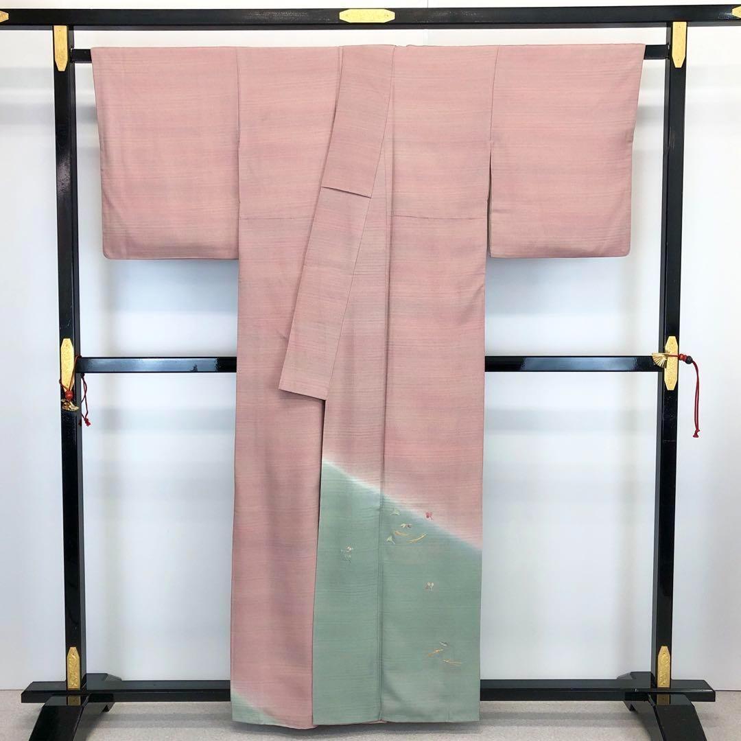 染分けの二色の色彩、似桃色ベースのお色味に刺繍、金駒で品良く散りばめられた松草模様の柄裄が素敵なお品でございます。