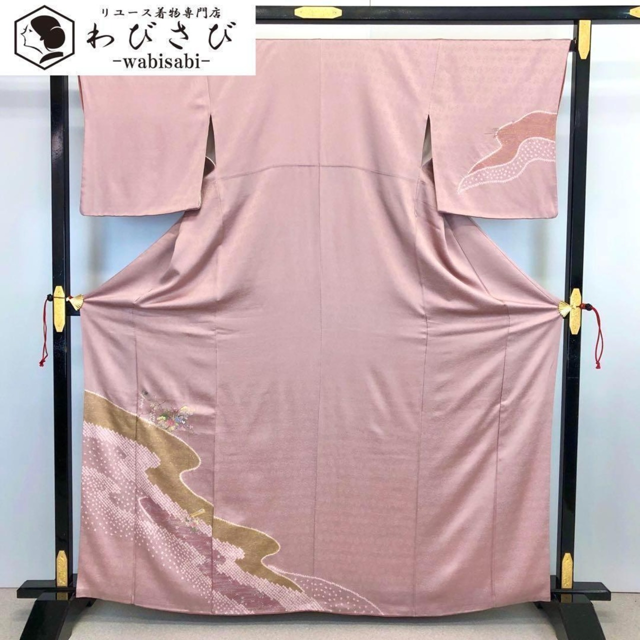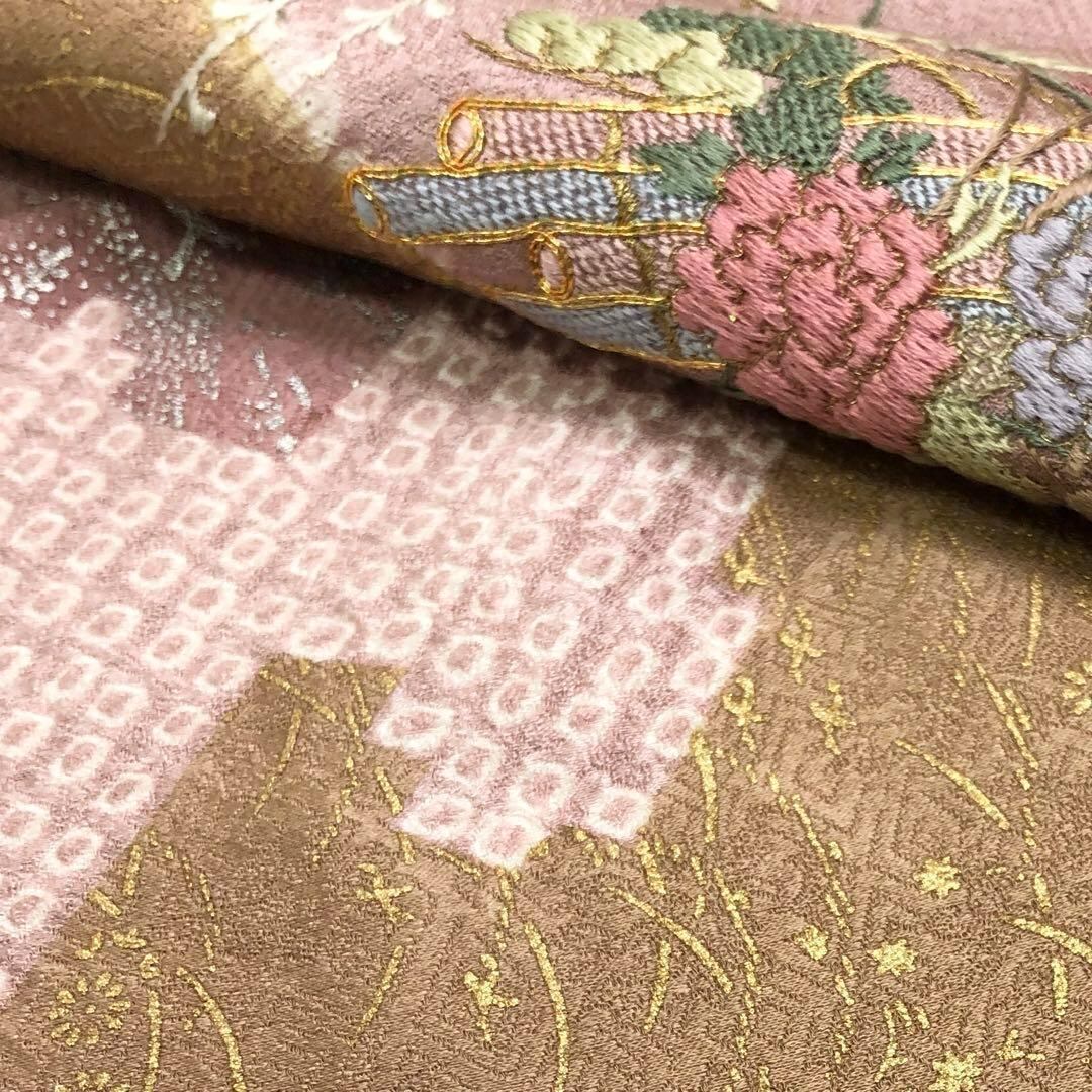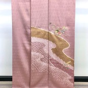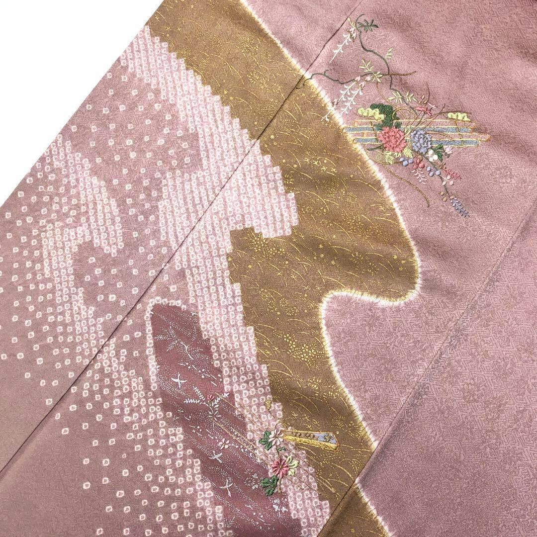 御所染色の品のあるお色味に地模様、鹿子柄、金彩などの流水模様に刺繍の花柄がポイントでデザインされた素敵な柄裄のお品でございます。