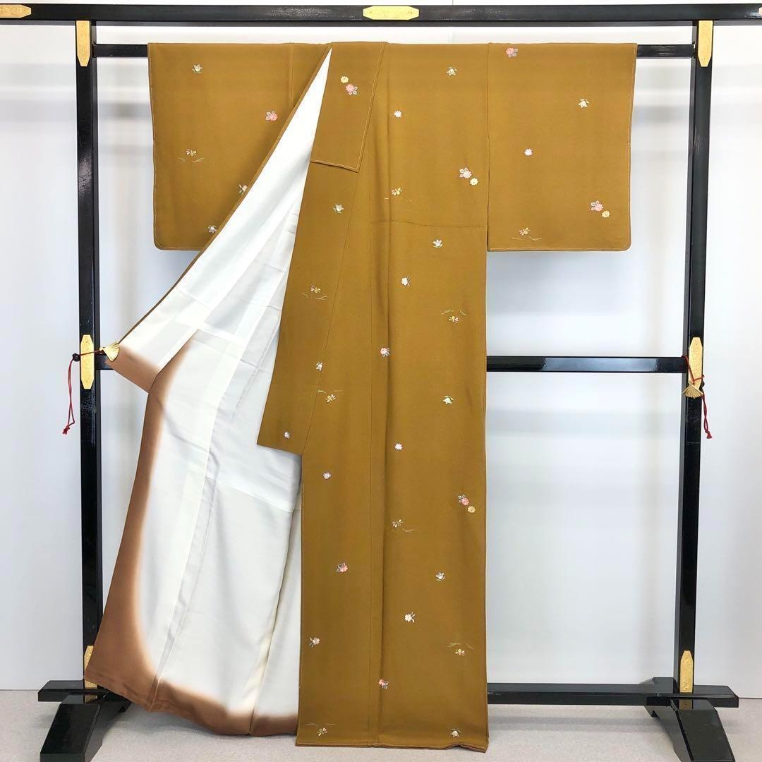 幸福小紋と題された黄茶色の落ち着きのある色味の丹後縮緬に刺繍の飛び柄でデザインされた松花の柄裄が素敵なお品でございます。