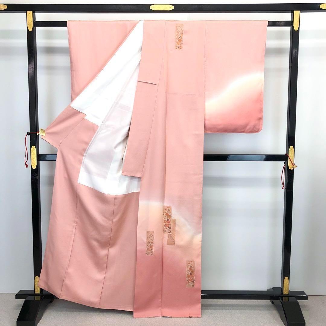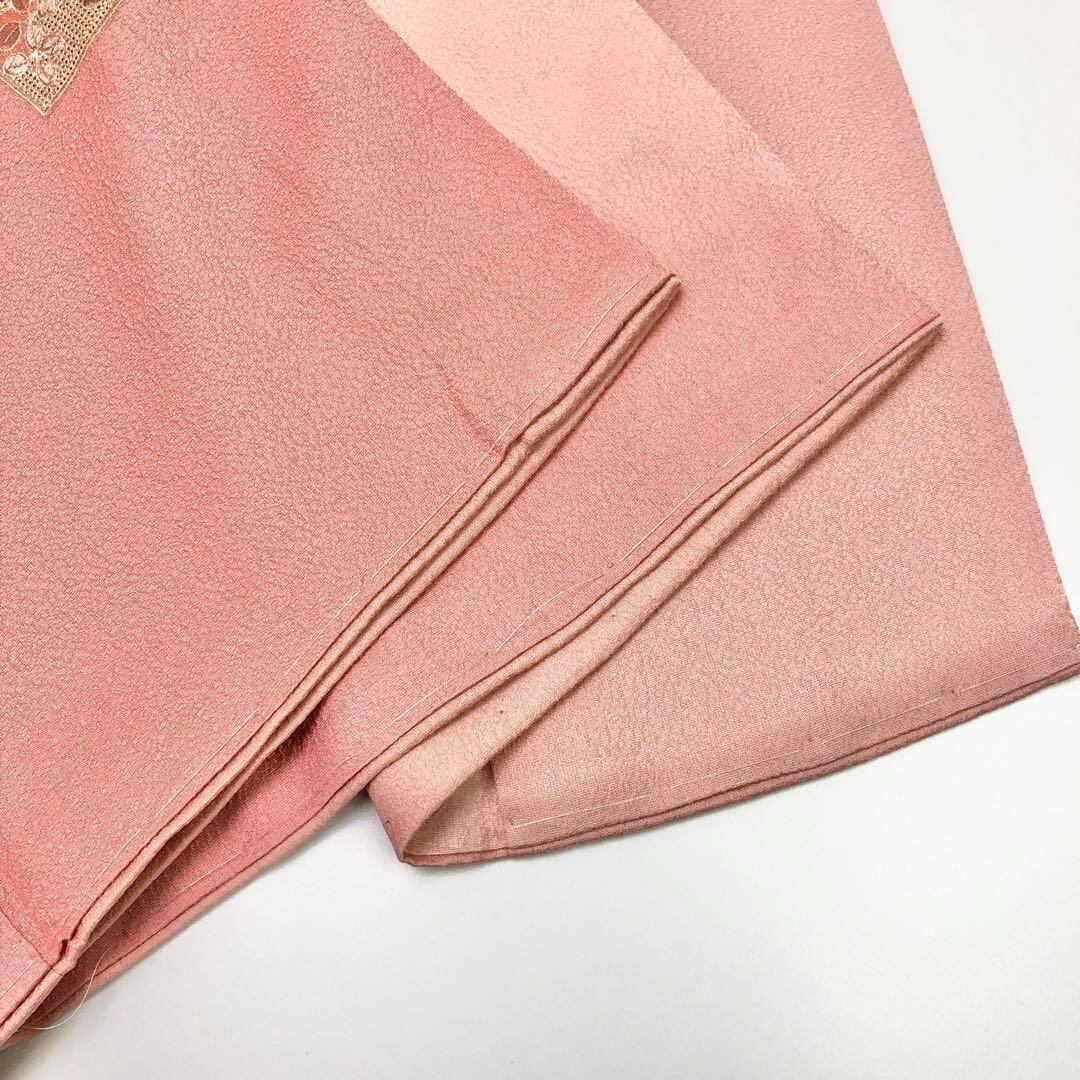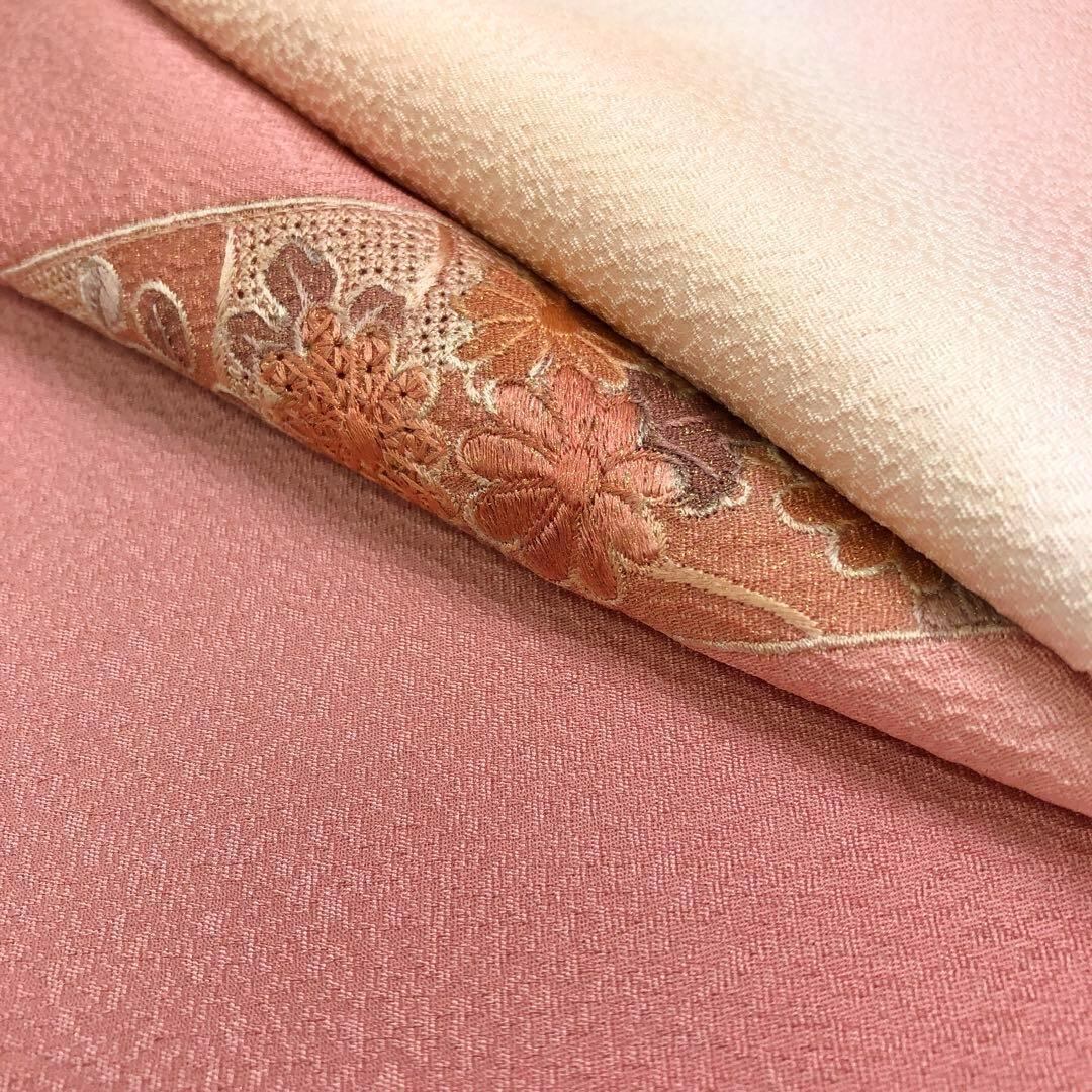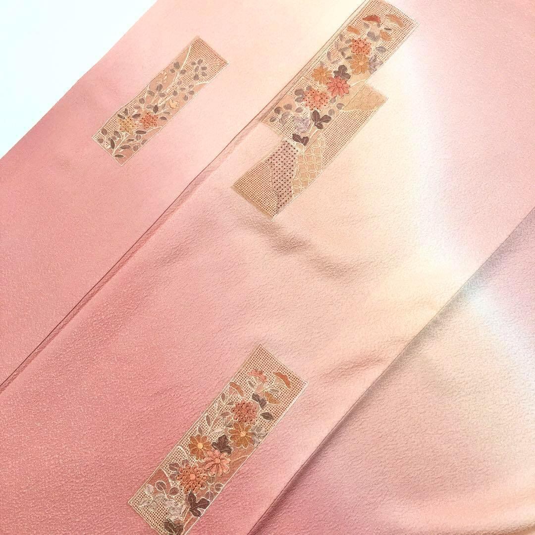 一重梅色の上品なお色味に暈し、縦長の四角に刺繍でデザインされた花柄模様が素敵な柄裄のお品でございます。