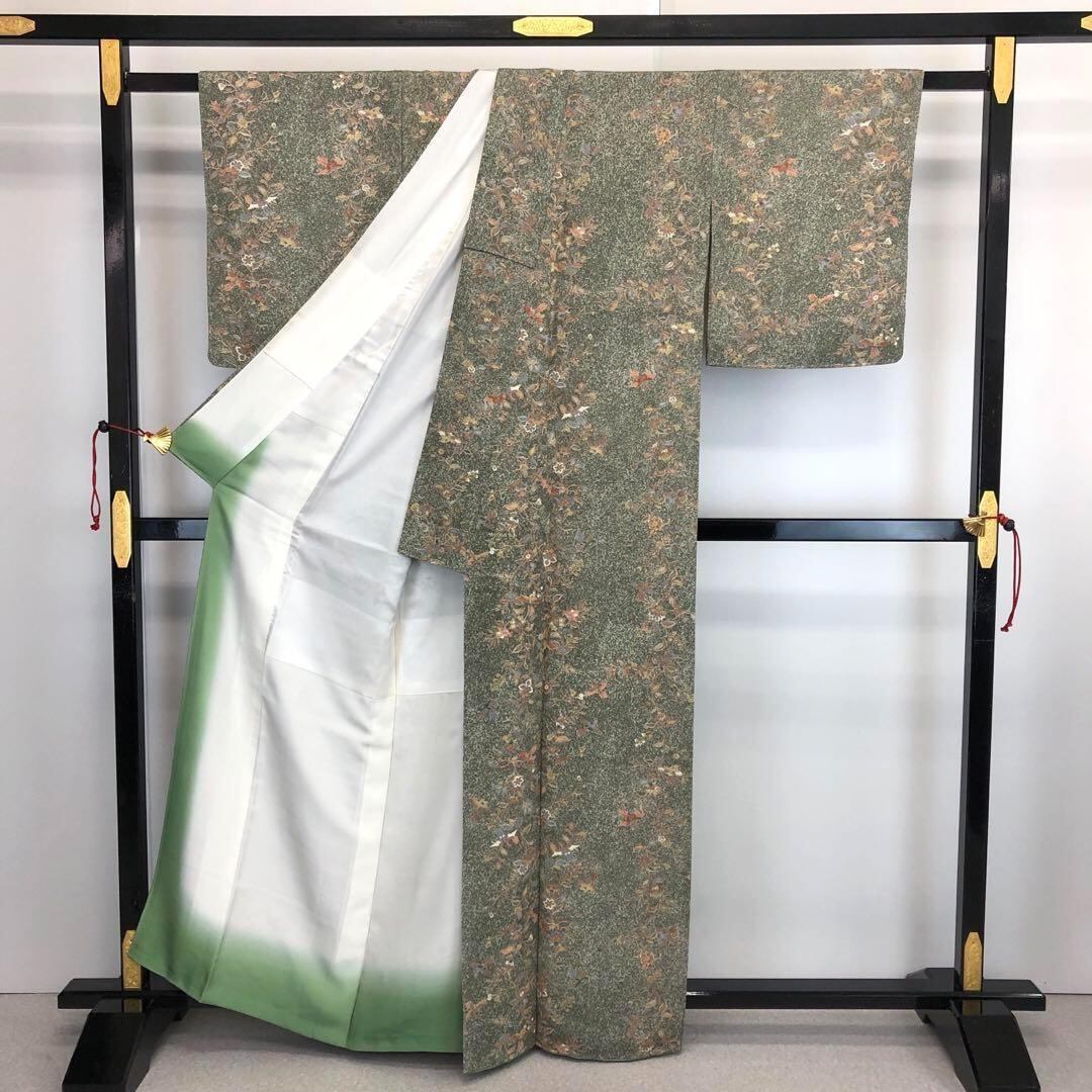 利休鼠色の縮緬に叩き染、色彩豊かな花唐草模様に鳥の柄裄がデザインされた素敵なお品でございます。