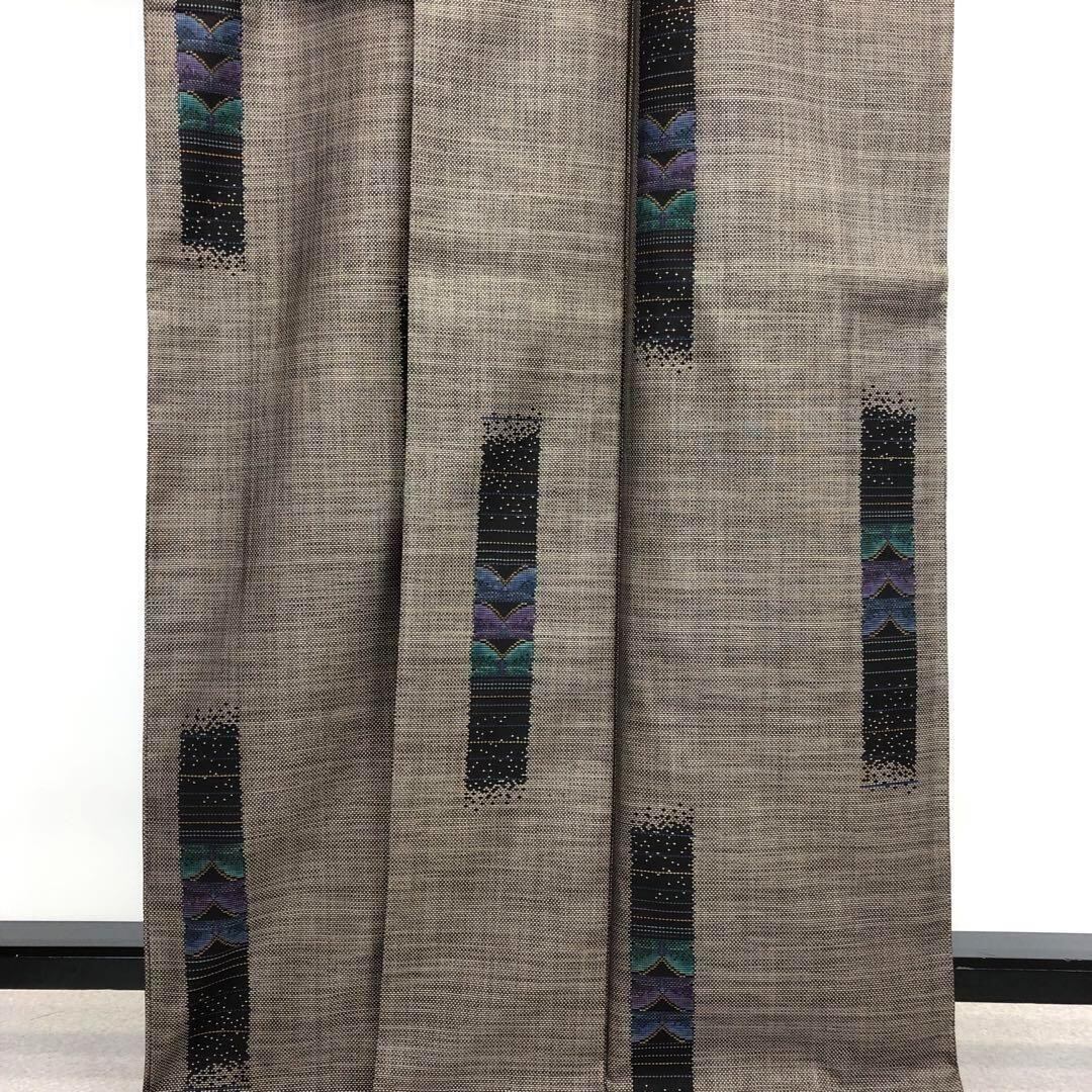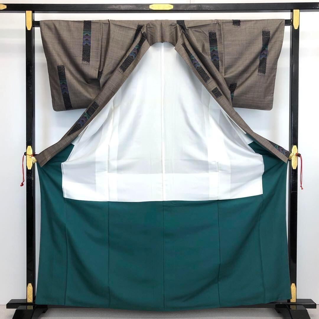 茶泥染の風合いの良い色合いに縦柄の四角に色彩鮮やかな蝶々柄がデザインされた素敵な柄裄のお品でございます。