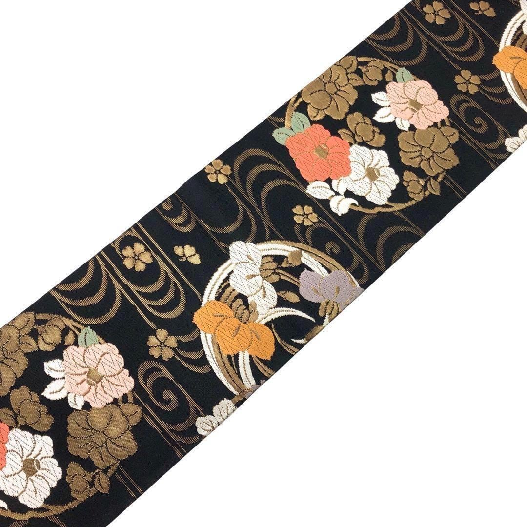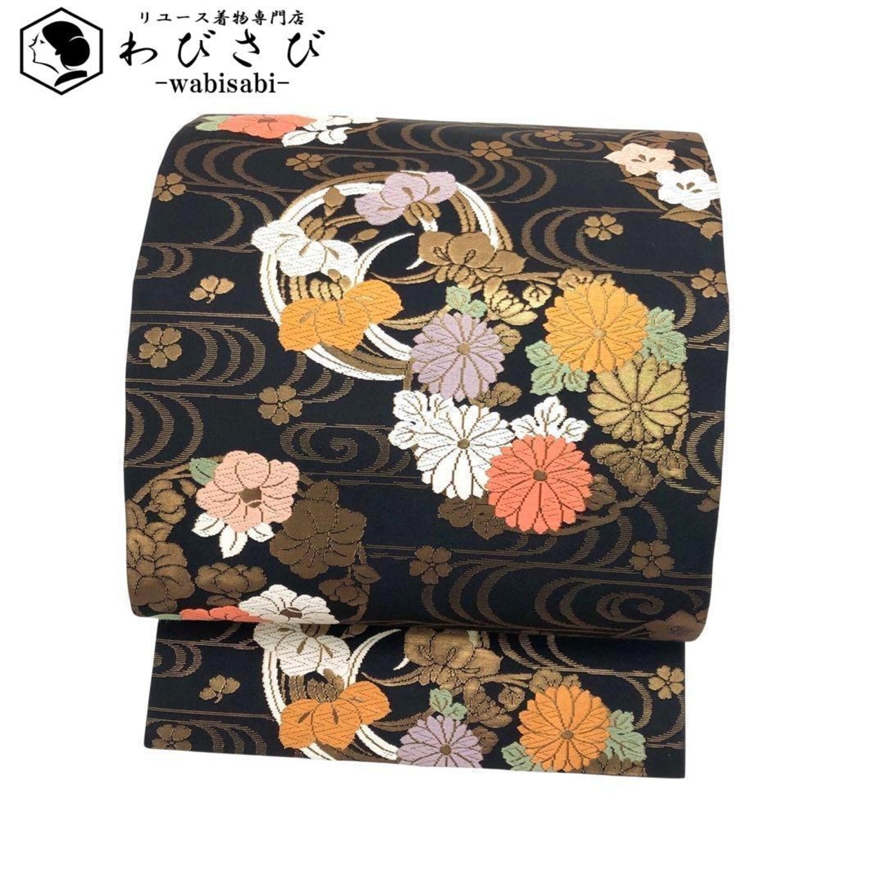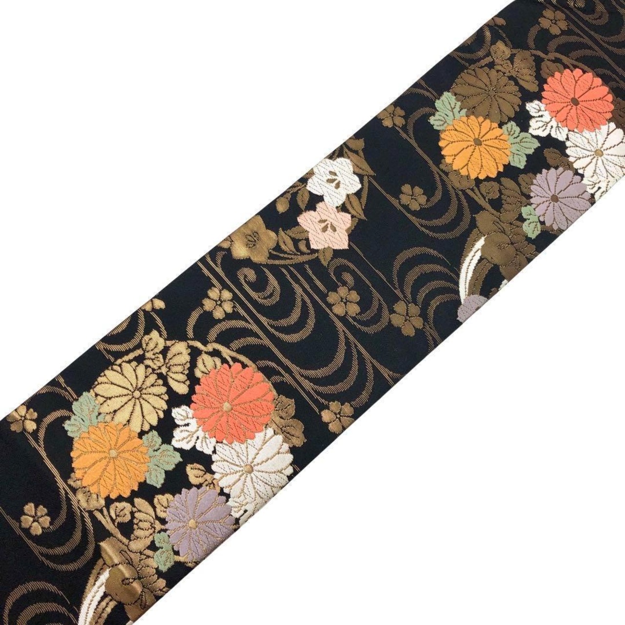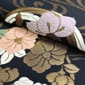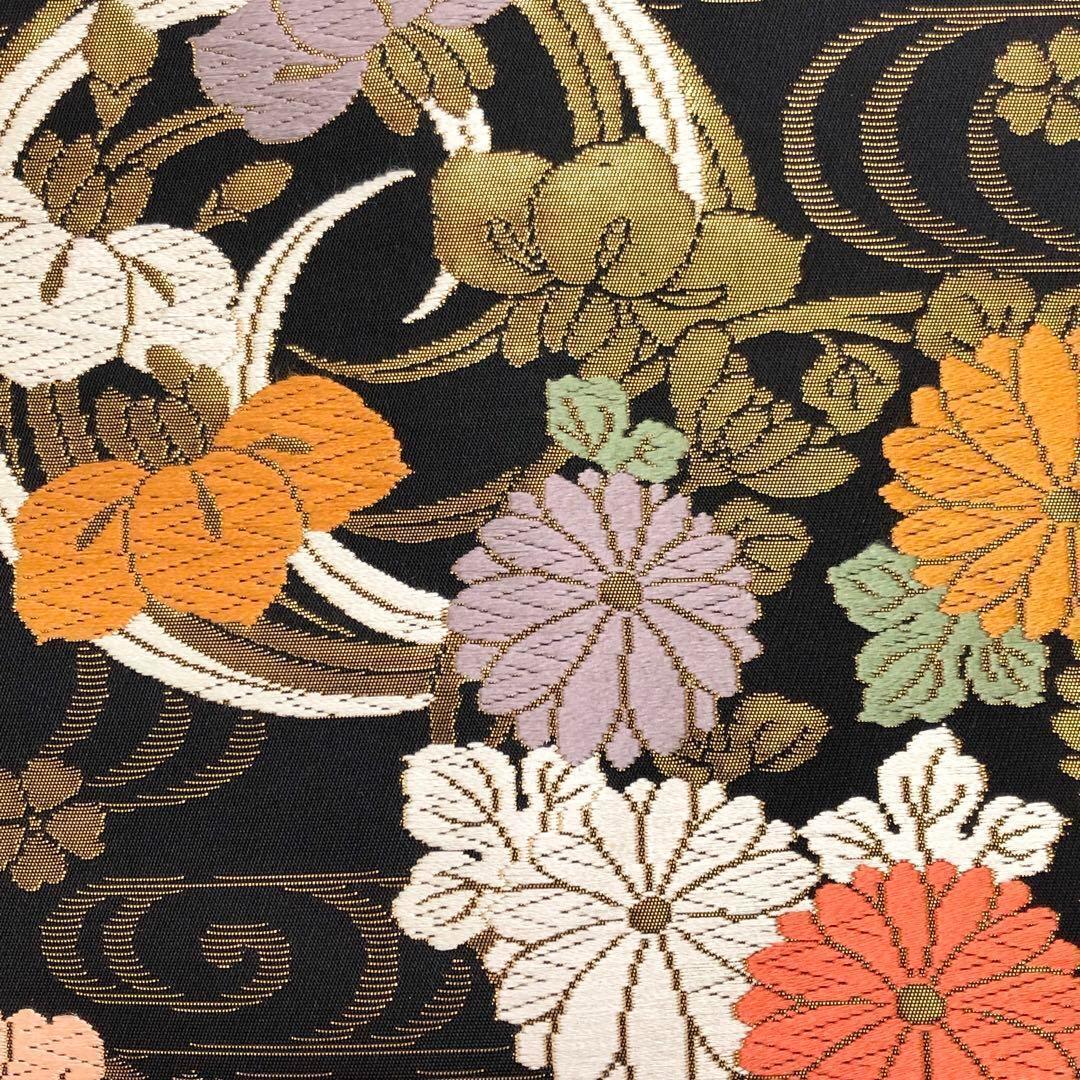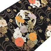 黒色のお色味に金糸が使われた流水模様、丸に色鮮やかな花柄がデザインされた素敵な柄裄のお品でございます。
