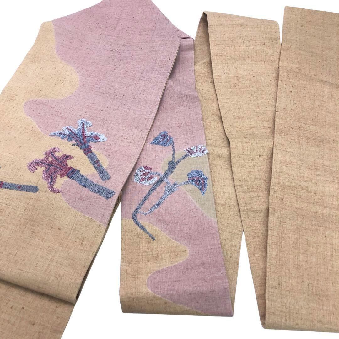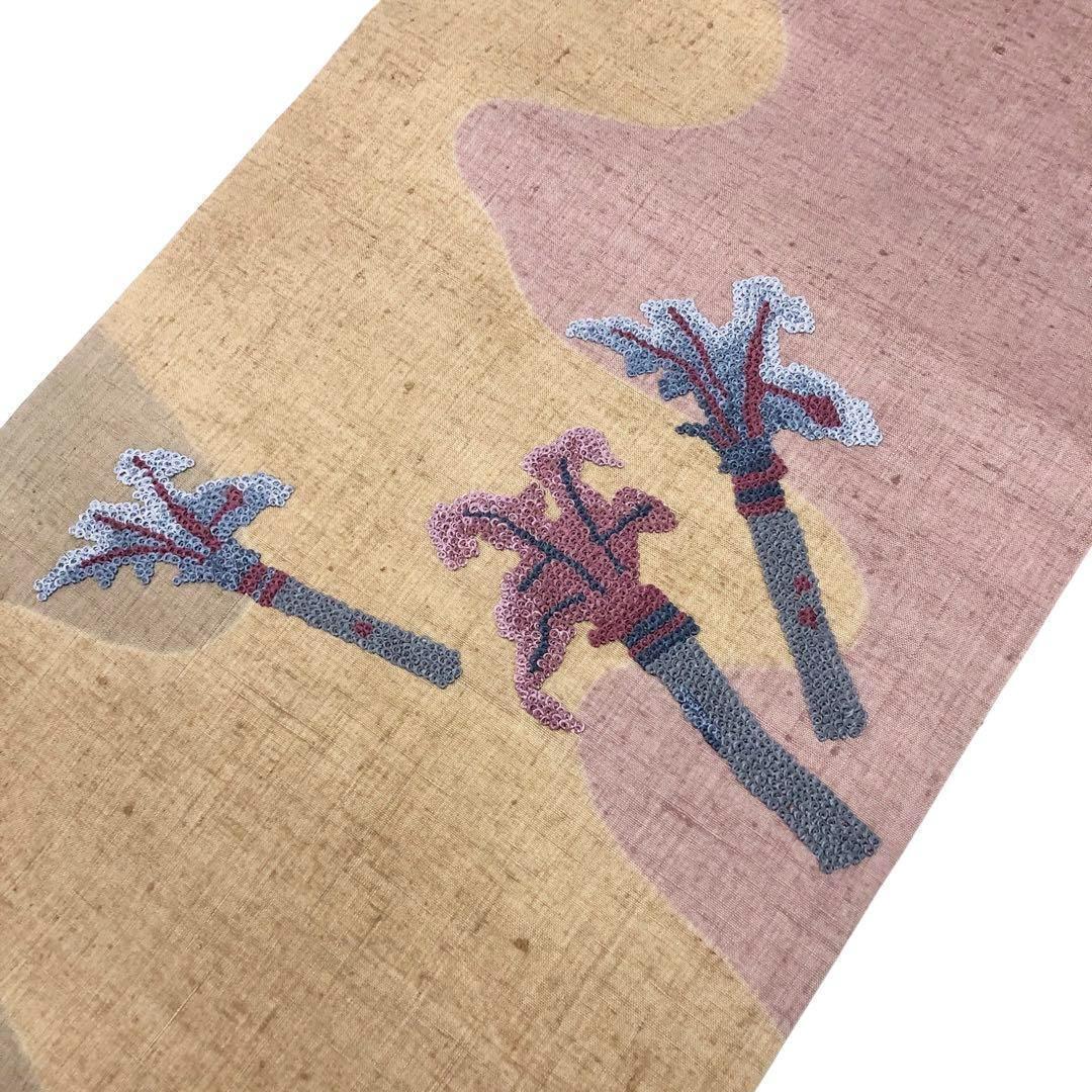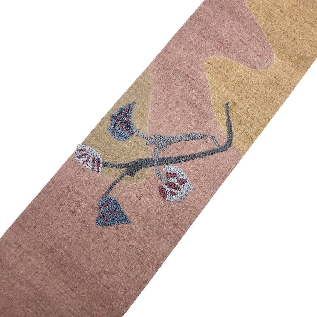 枯野色ベースの染分けの紬に刺繍柄の抽象草花模様がデザインされた素敵な柄裄のお品でございます。