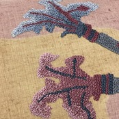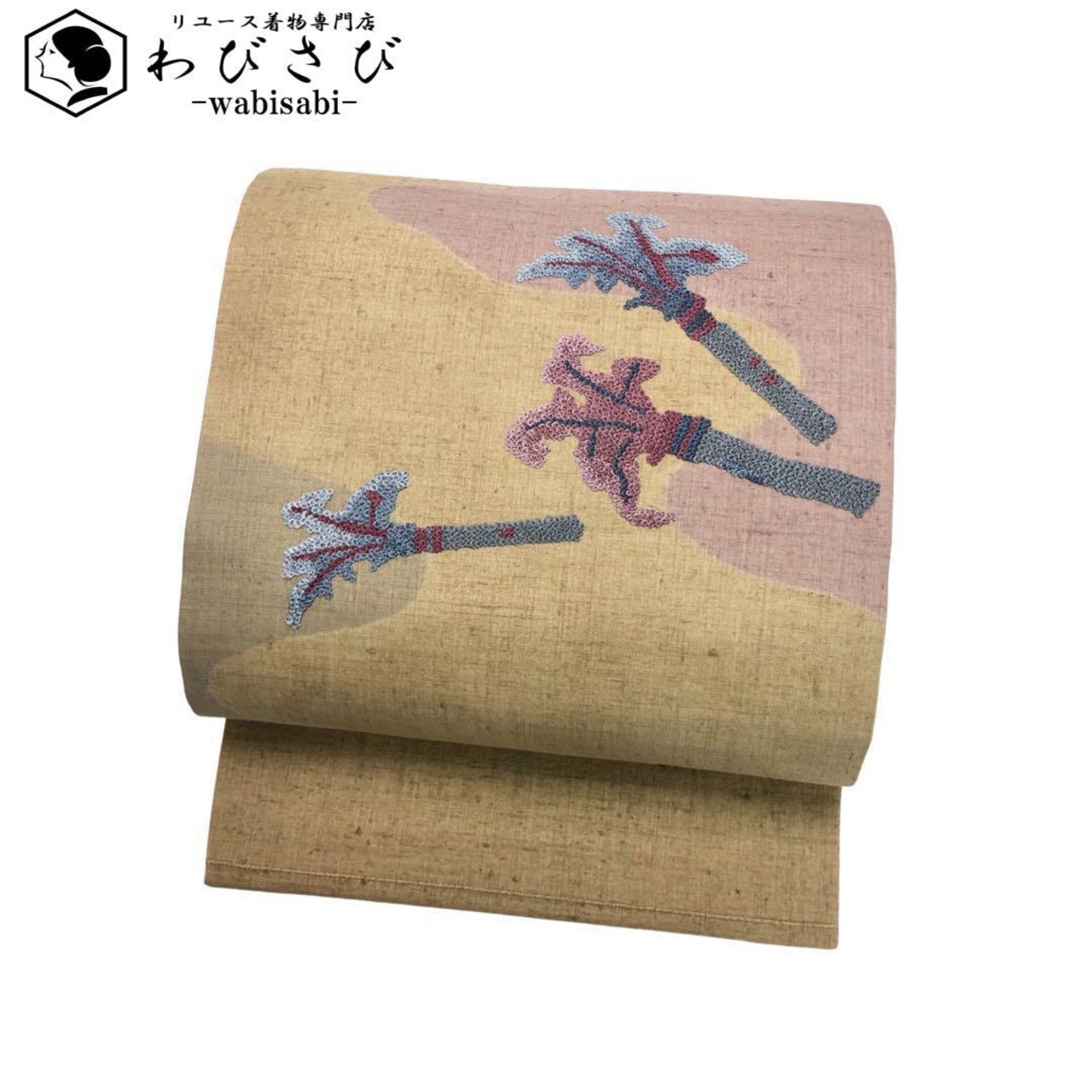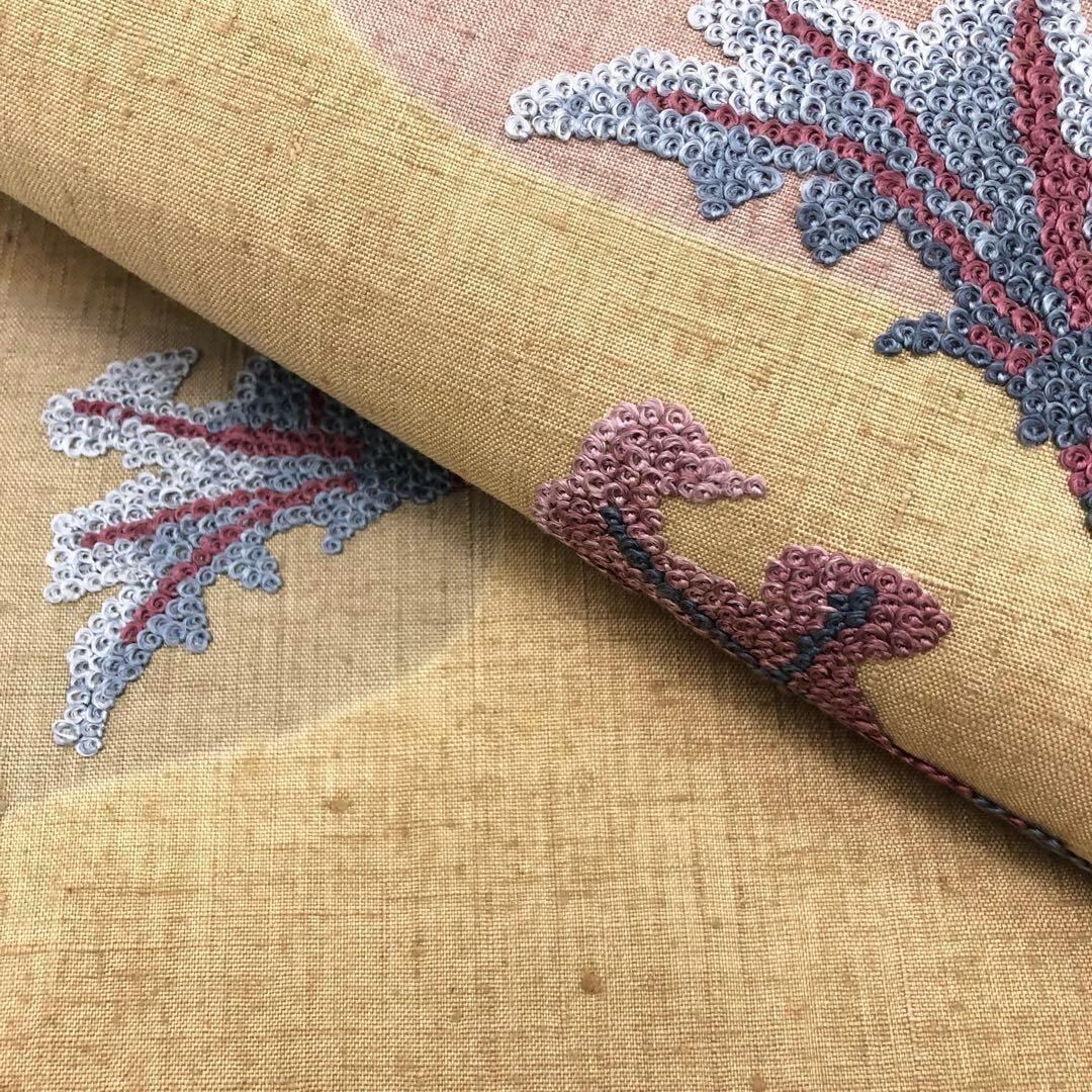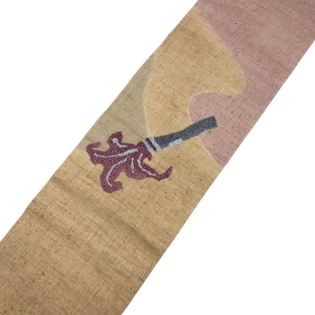 枯野色ベースの染分けの紬に刺繍柄の抽象草花模様がデザインされた素敵な柄裄のお品でございます。