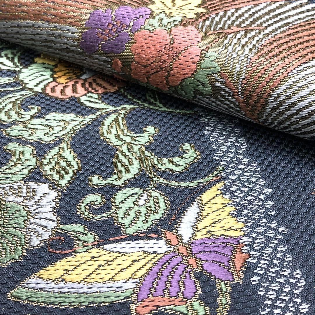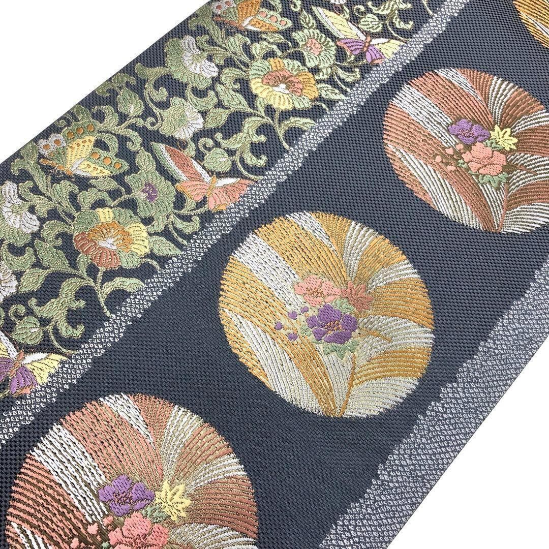 錫紵色のお色味に縦柄花唐草模様に蝶々、丸の中に花柄がデザインされた素敵な柄裄のお品でございます。