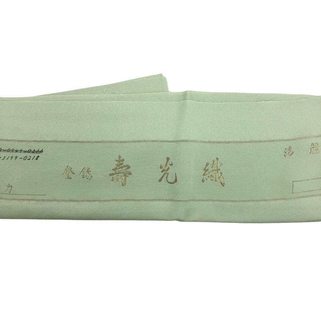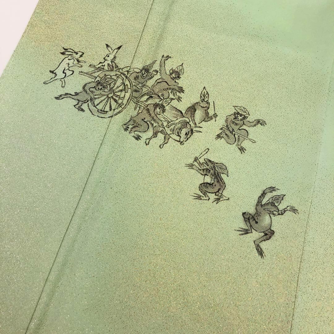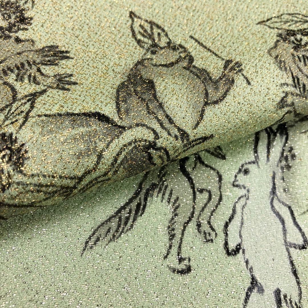 薄緑色の寿光織の金糸が輝く上質な手触りの生地に手描きの鳥獣戯画の柄裄がデザインされた素敵なお品でございます。
