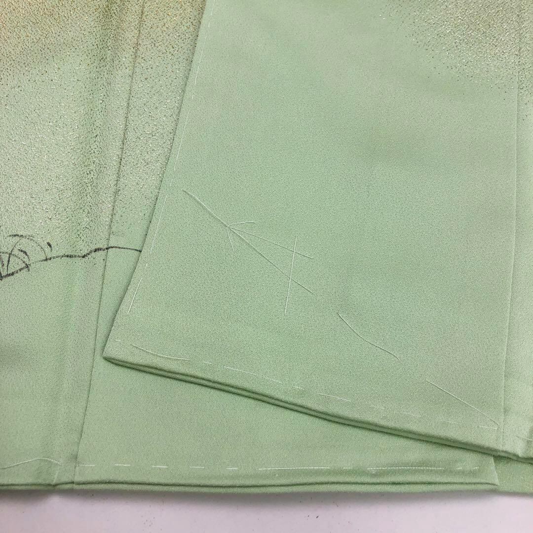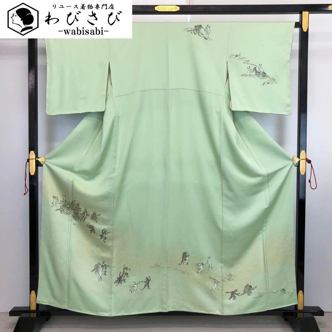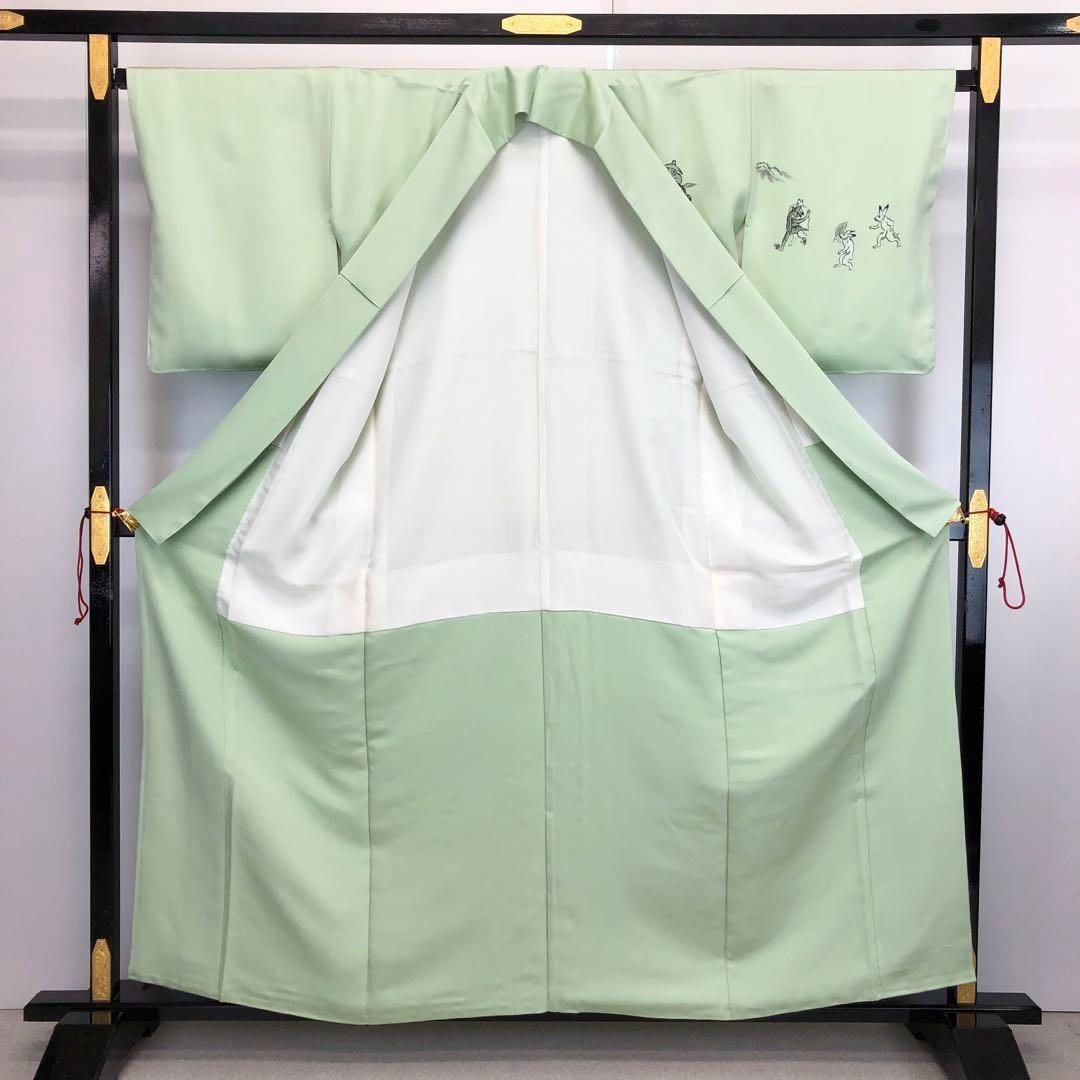 付下げ 鳥獣戯画 手描き 寿光織 薄緑色 しつけ糸 K-3566 着物 きもの kimono 和服 和装 中古 リサイクル着物 【送料無料】
