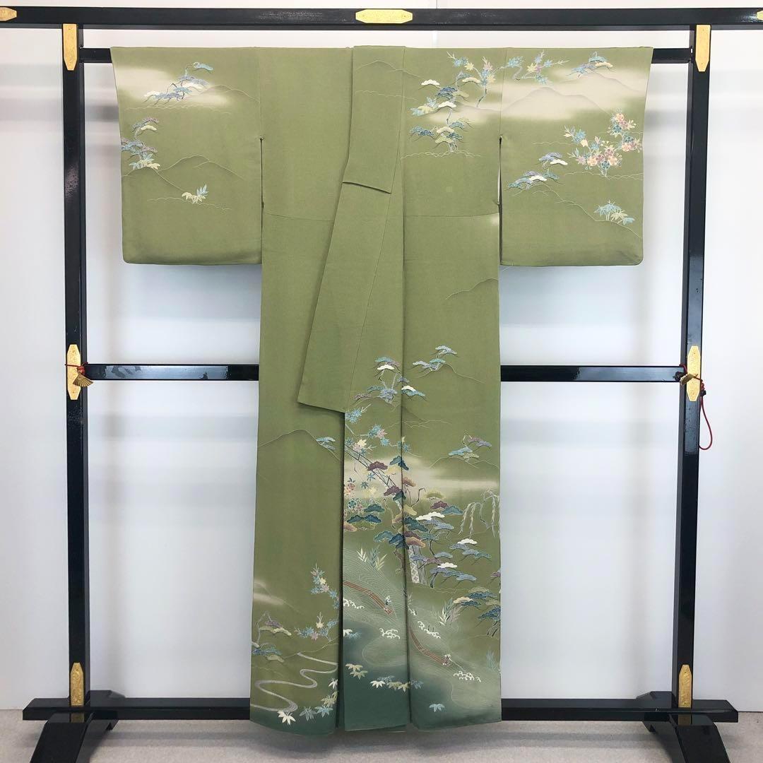 梅幸茶色の縮緬に暈し、松、笹、楓などに山川の風景柄がデザインされた素敵な柄裄のお品でございます。