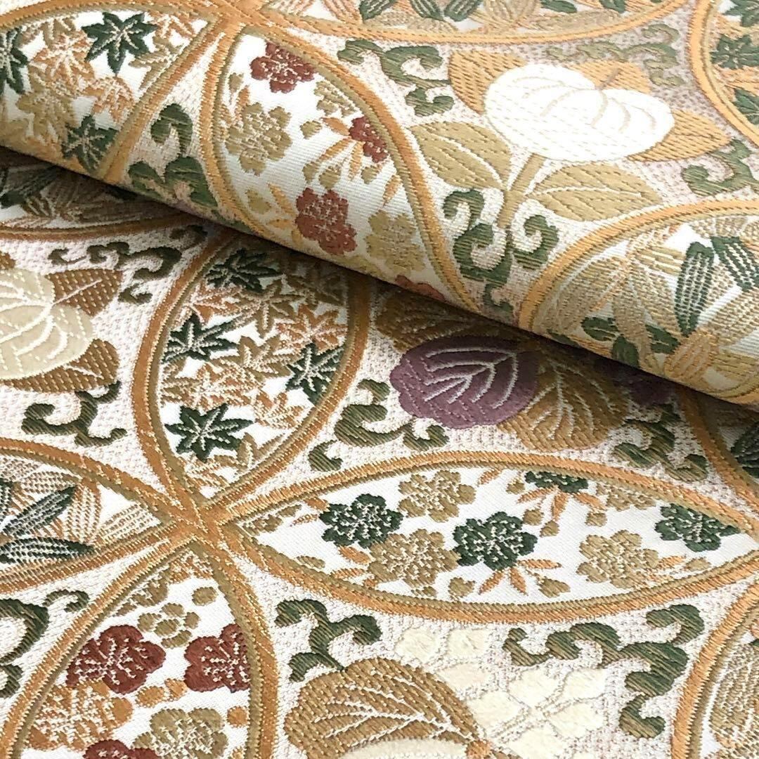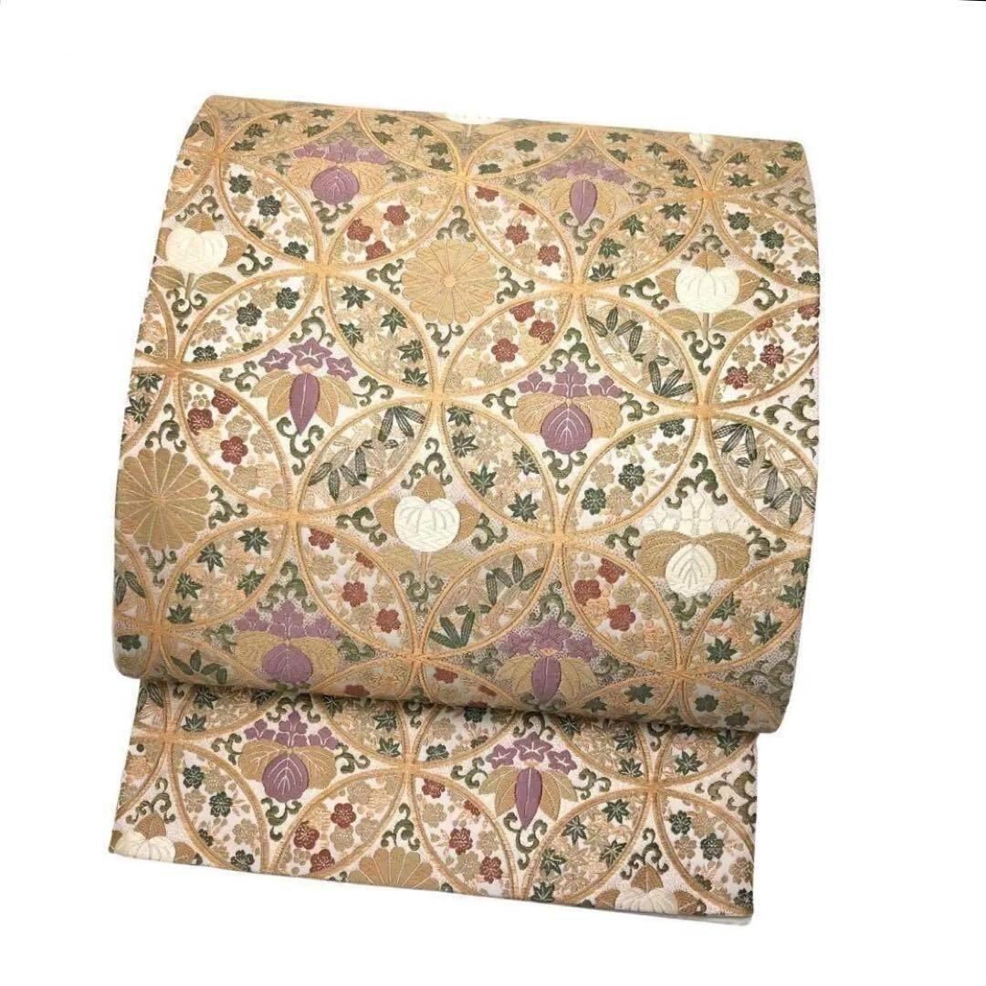 袋帯 隆盛宝華文 花七宝繋ぎ 花唐草 金糸 胡粉色 O-3490 着物 きもの kimono 和服 和装 中古 リサイクル着物 【送料無料】
