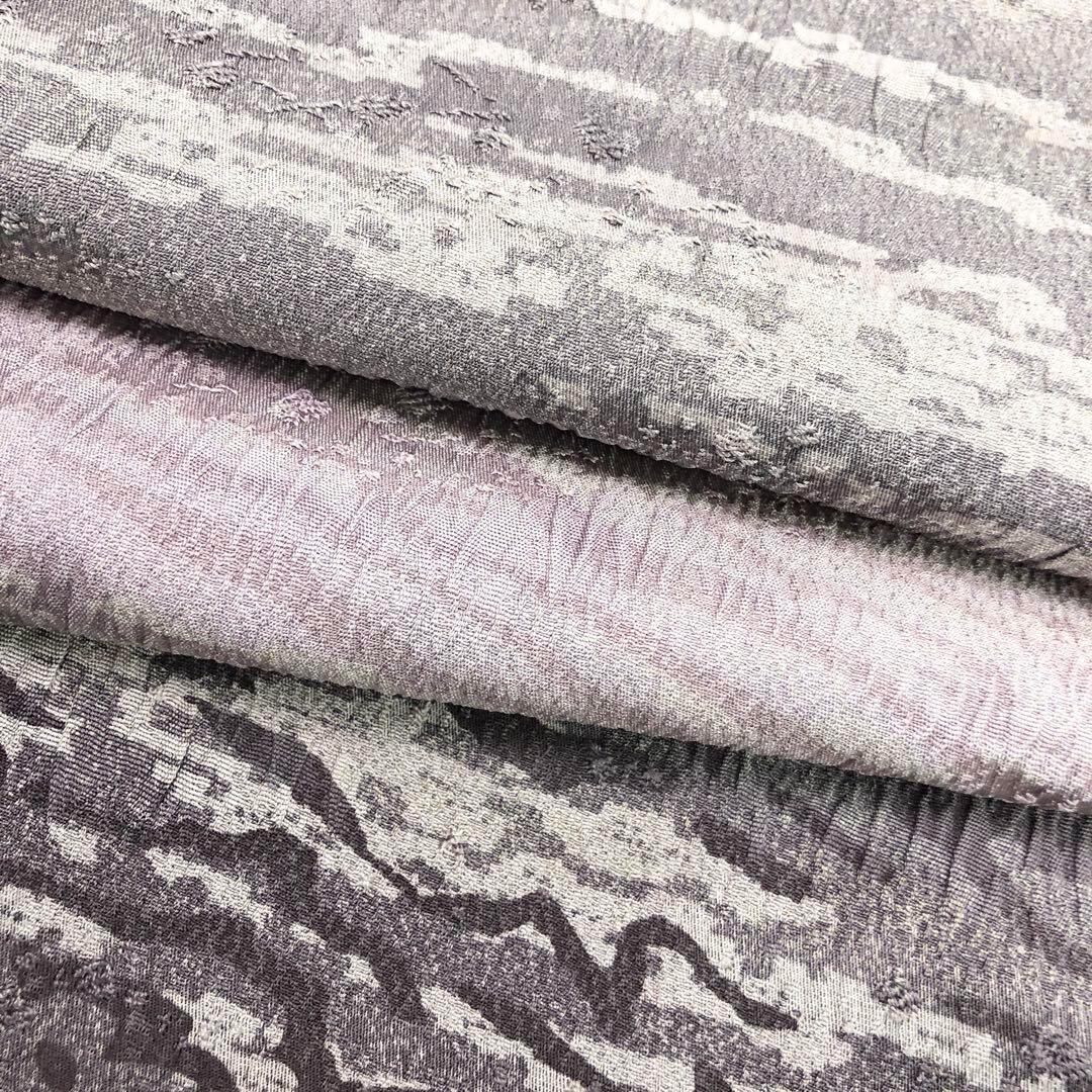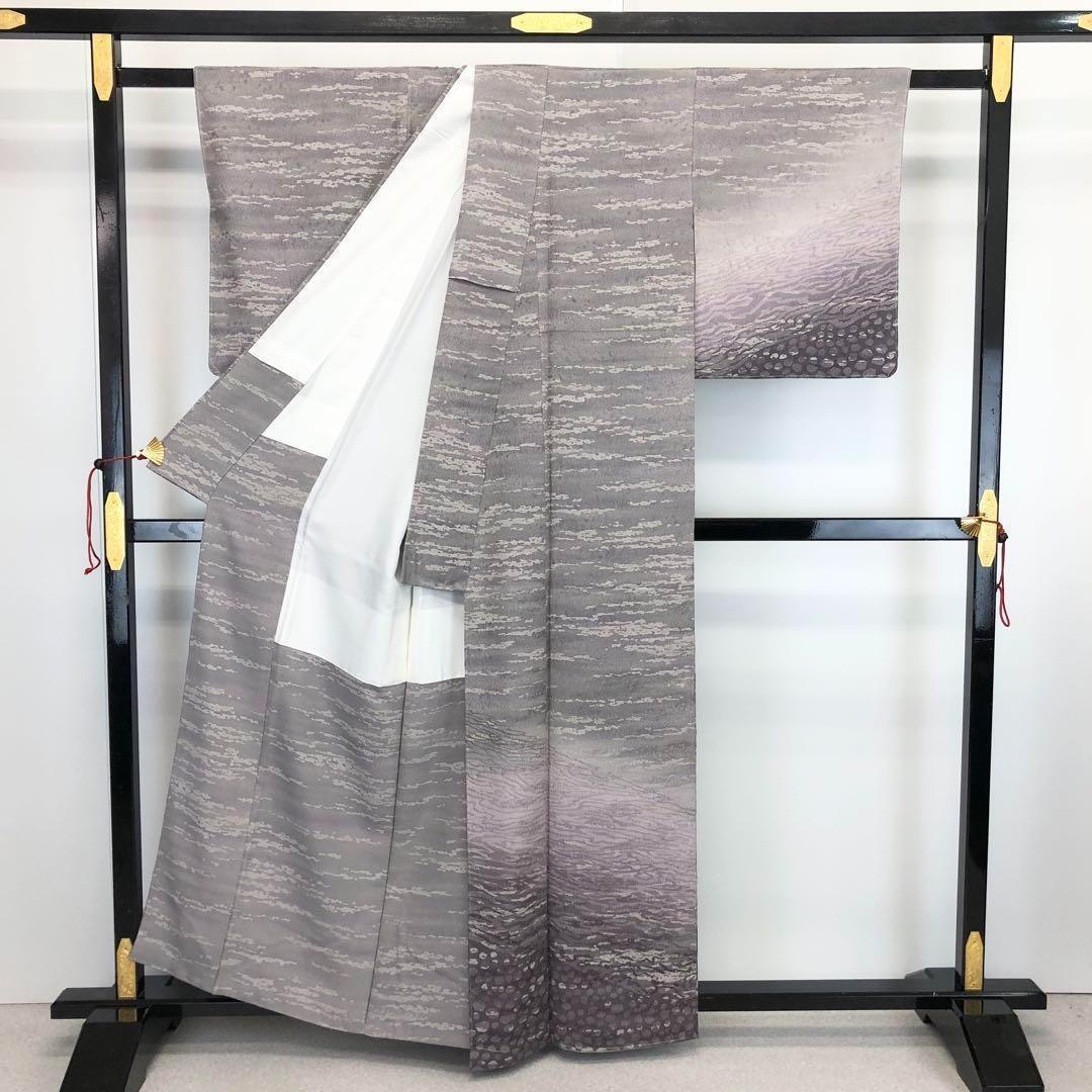 薄鳩羽鼠色の縮緬に霞模様に暈しの色彩、モダンな雰囲気を感じられる素敵な柄行のお品でございます。