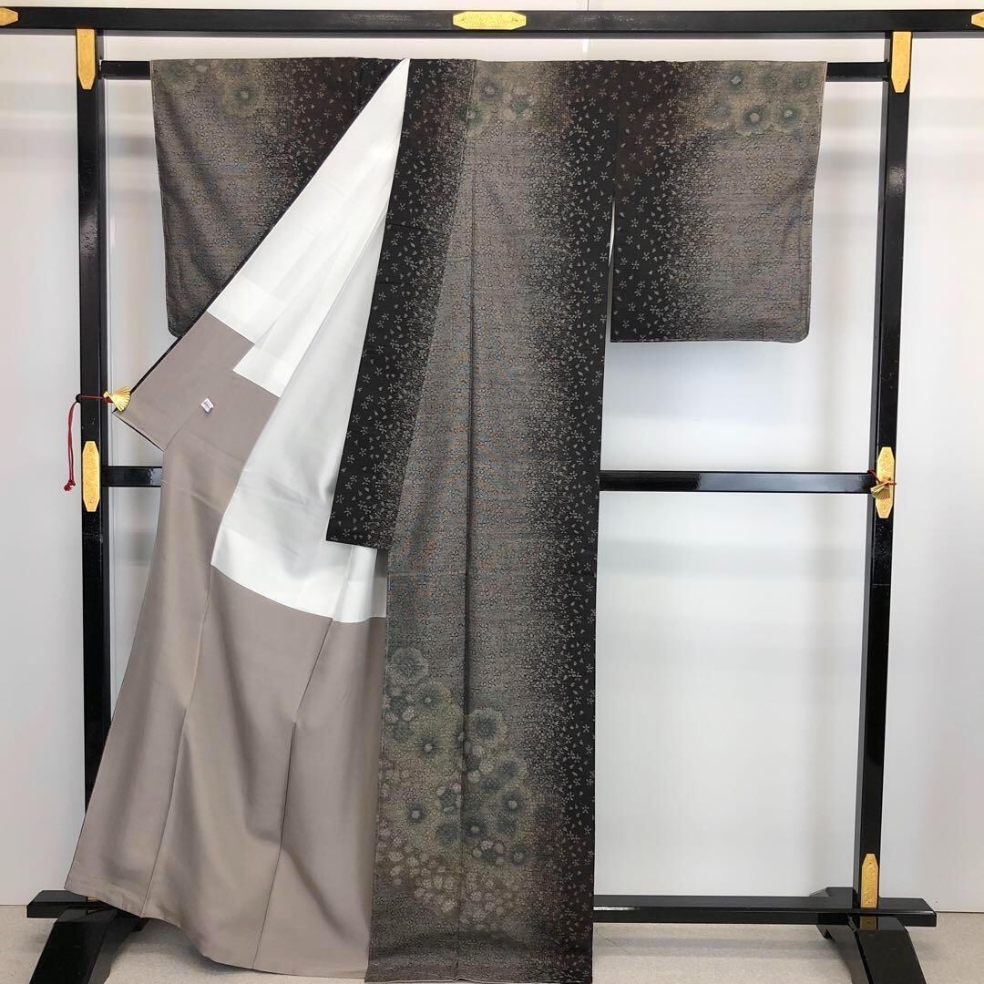 車輪梅工芸、風合いの良い茶泥染のお色味に希少な割込式の織りの細かい花模様の織柄、更に絞りの花模様と縦柄の黒の色彩の柄裄も上品で美しい大変手のかかったと素敵な柄裄のお品でございます。