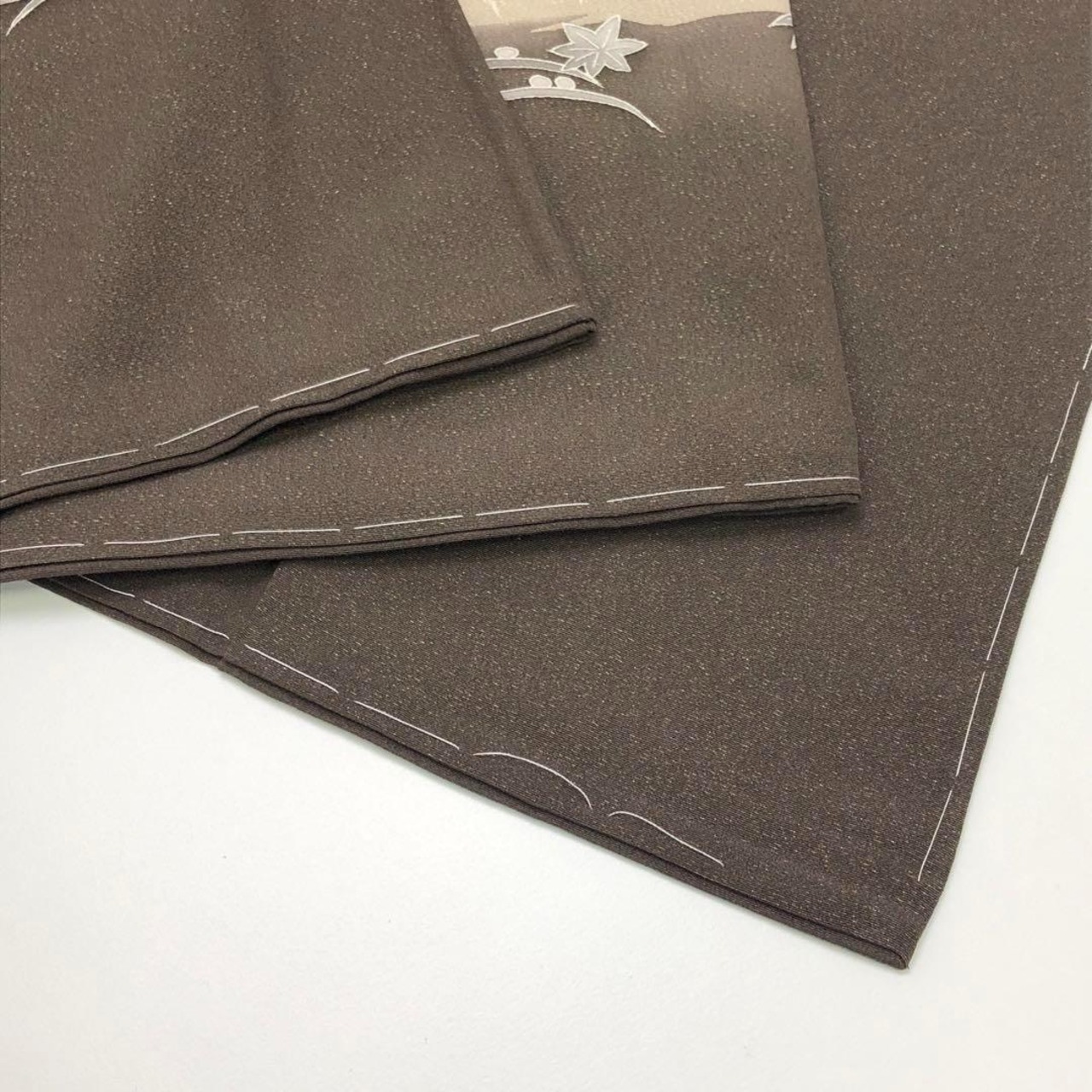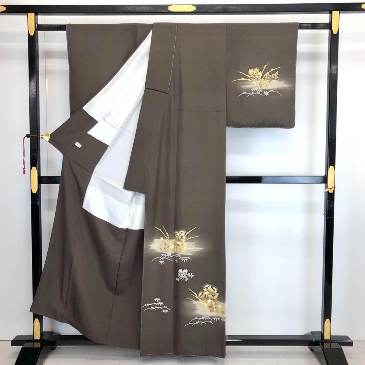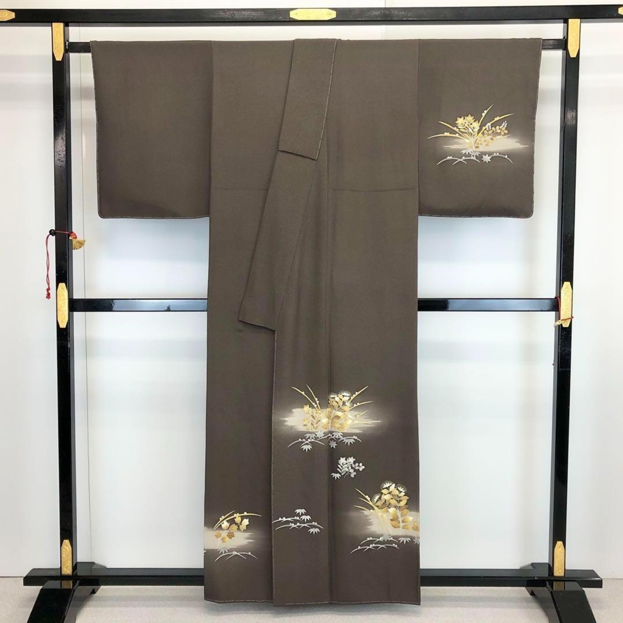 付下げ 本加賀友禅 鶴見保次 蒔絵風 花草模様 縮緬 栗鼠色 K-3600