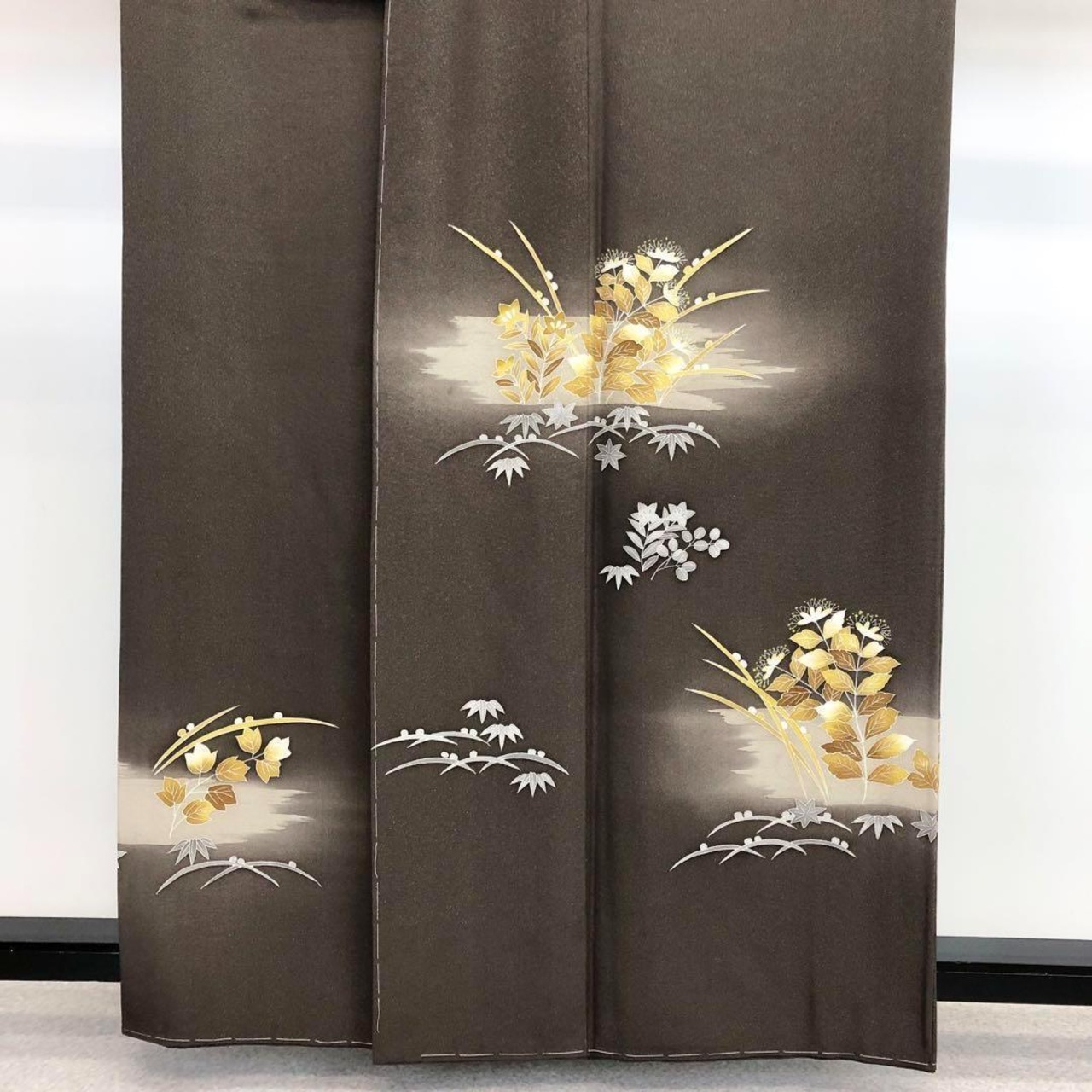 蒔絵風と題された栗鼠色の落ち着きのあるお色味に上品な花草模様の友禅の柄裄がデザインされた素敵な柄裄のお品でございます。