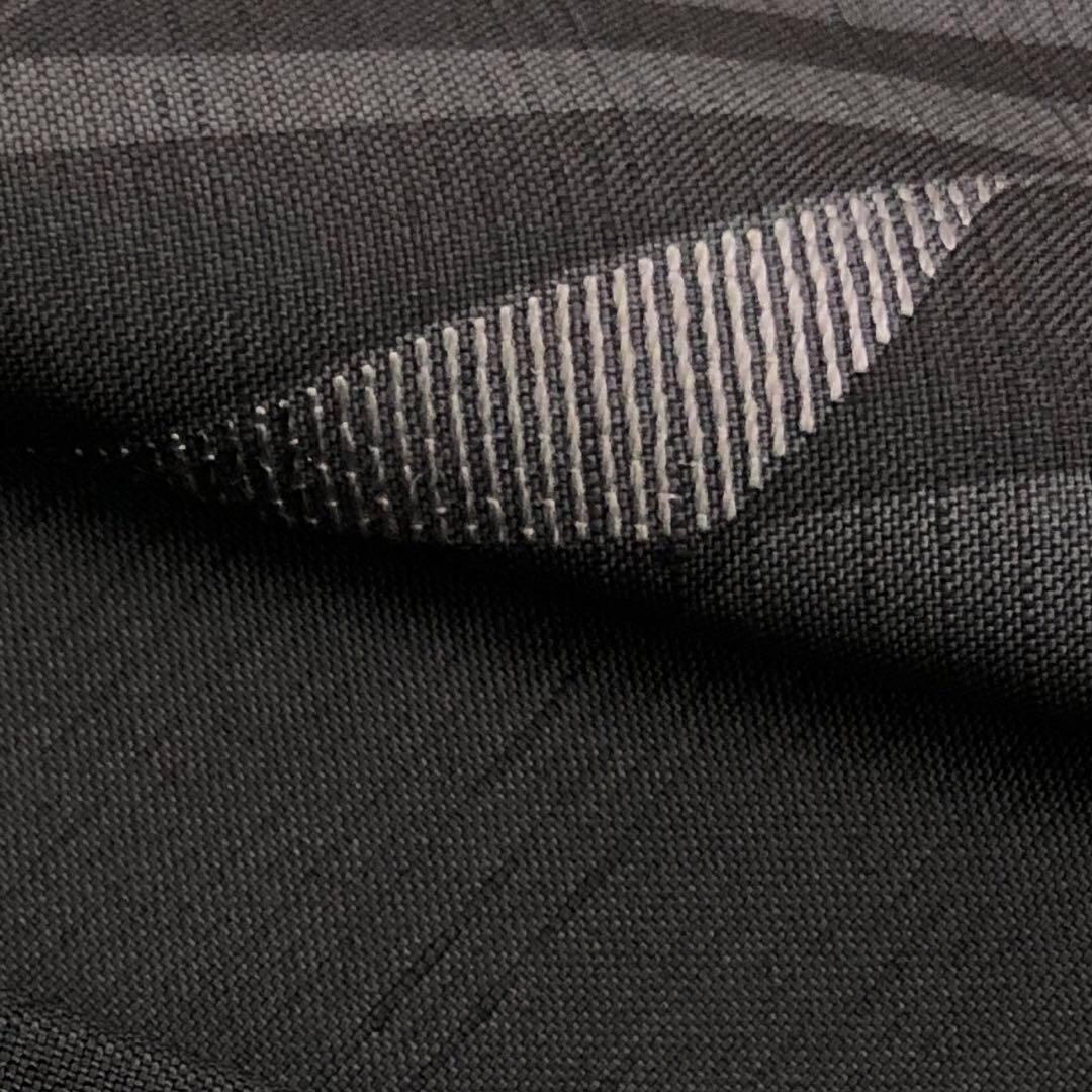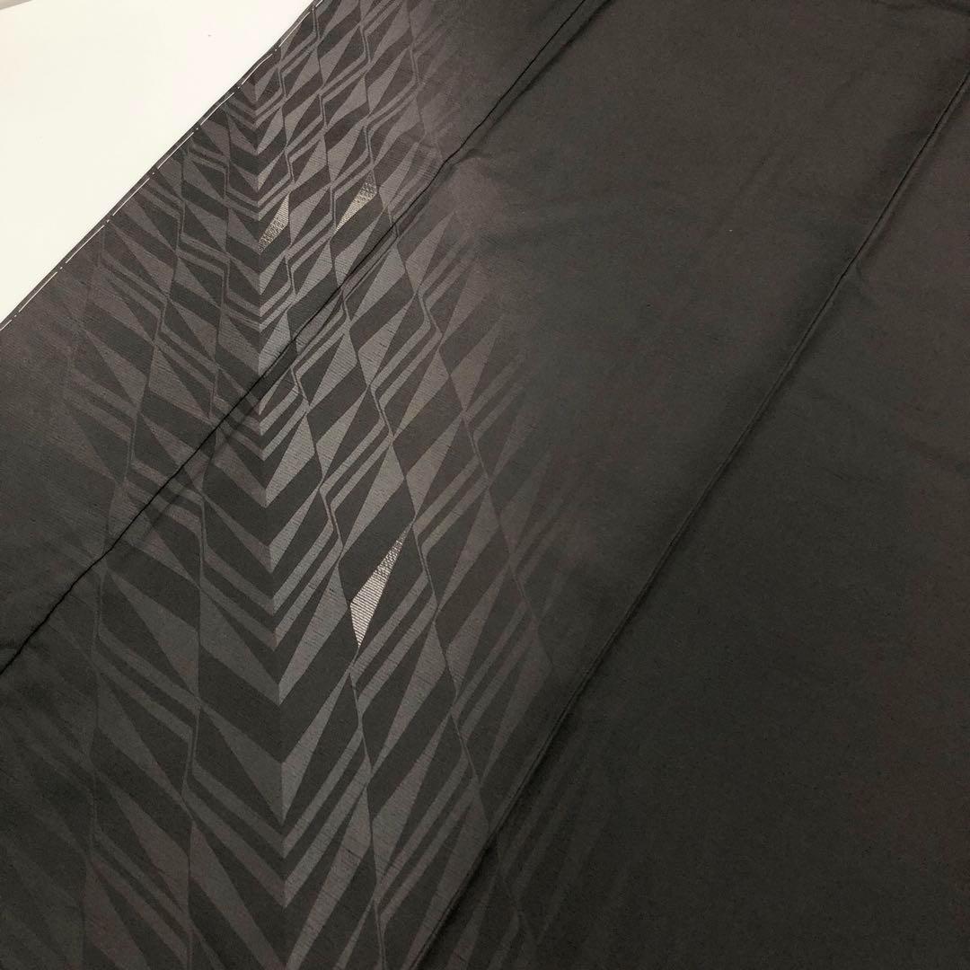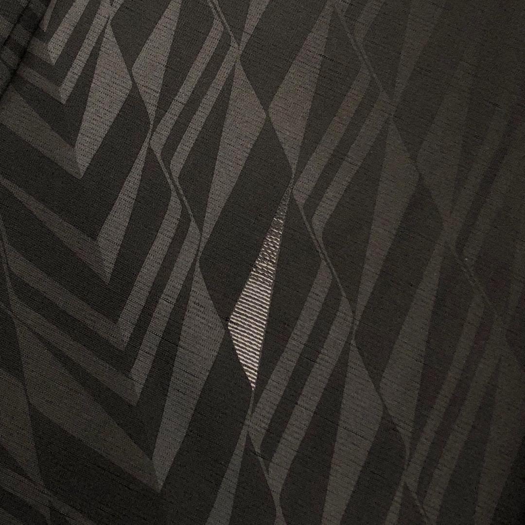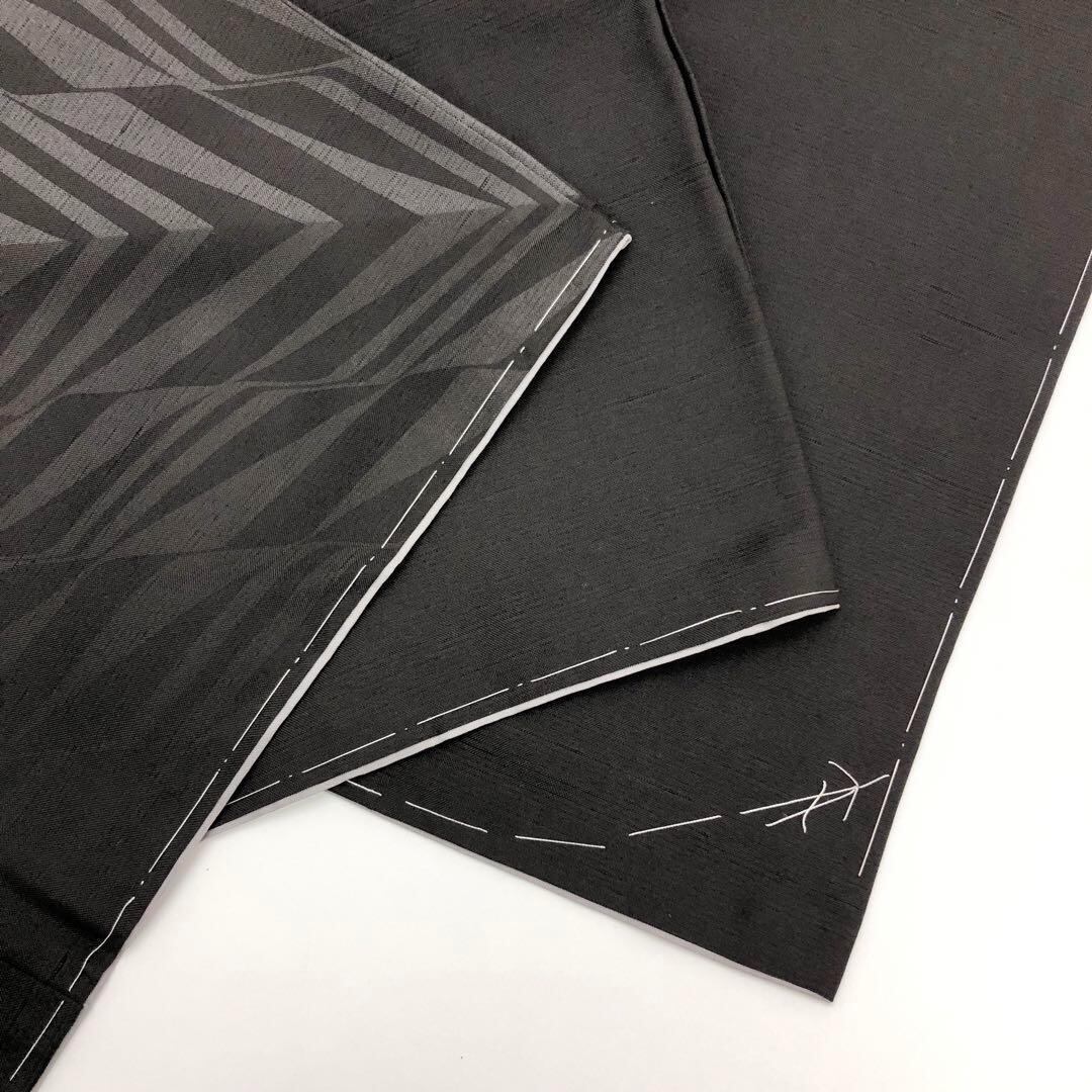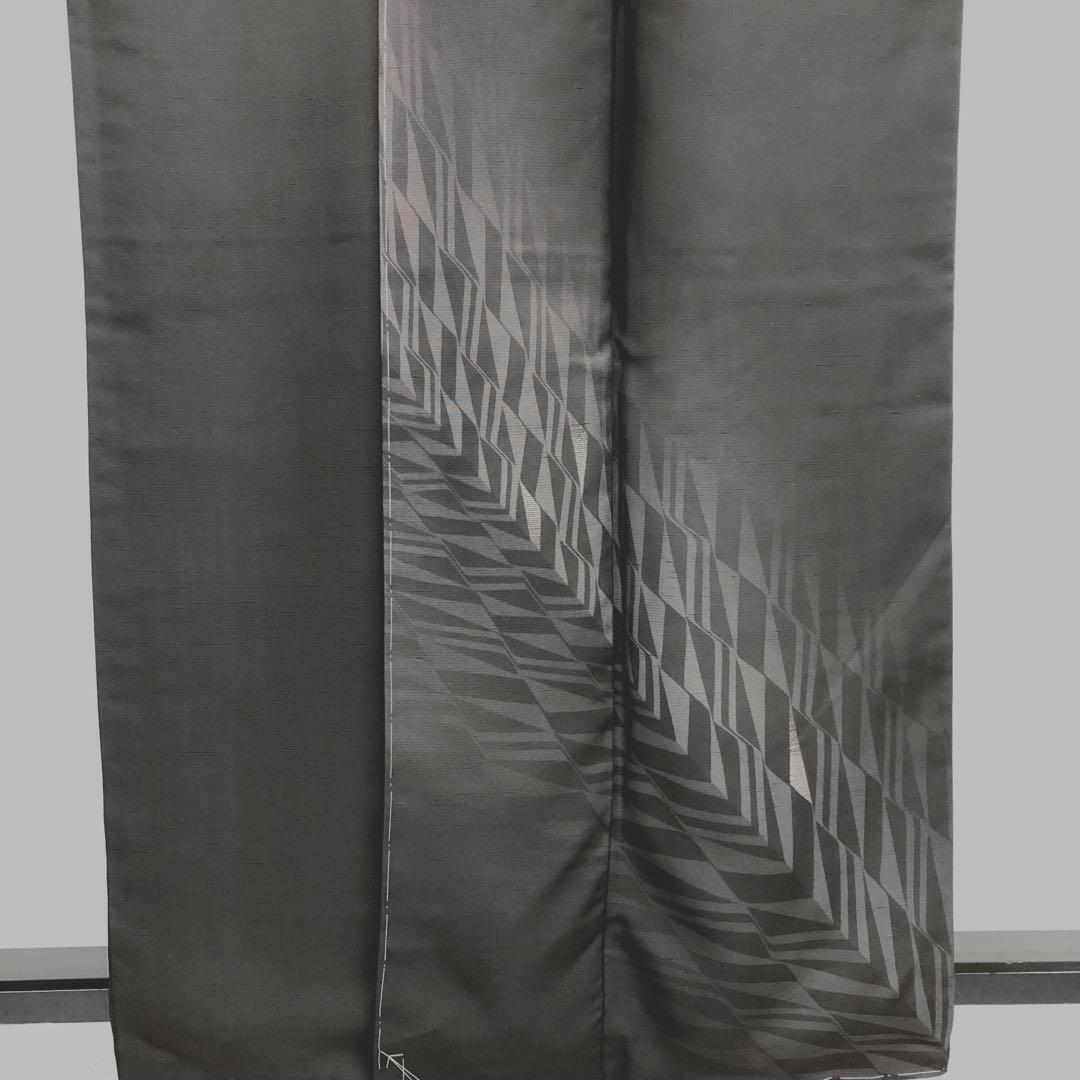 黒鼠色のシックなお色味に一部刺繍が使われたモダンな幾何学模様がデザインされたスタイリッシュな柄裄のお品でございます。