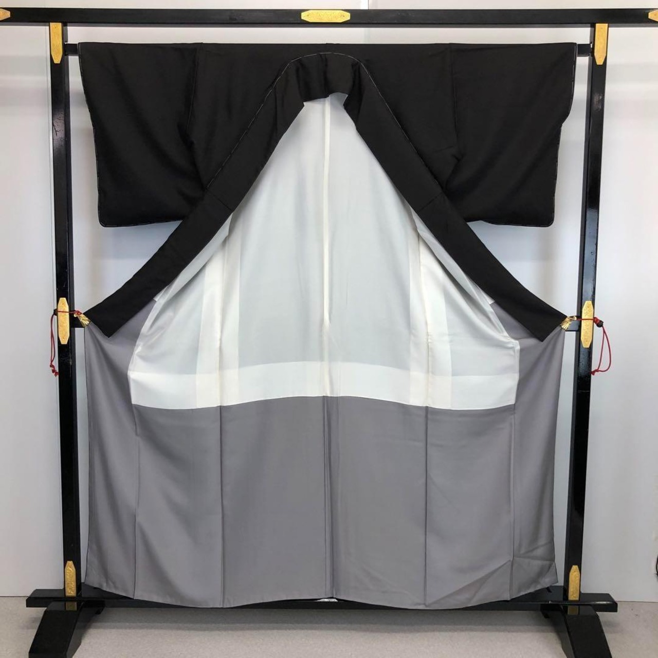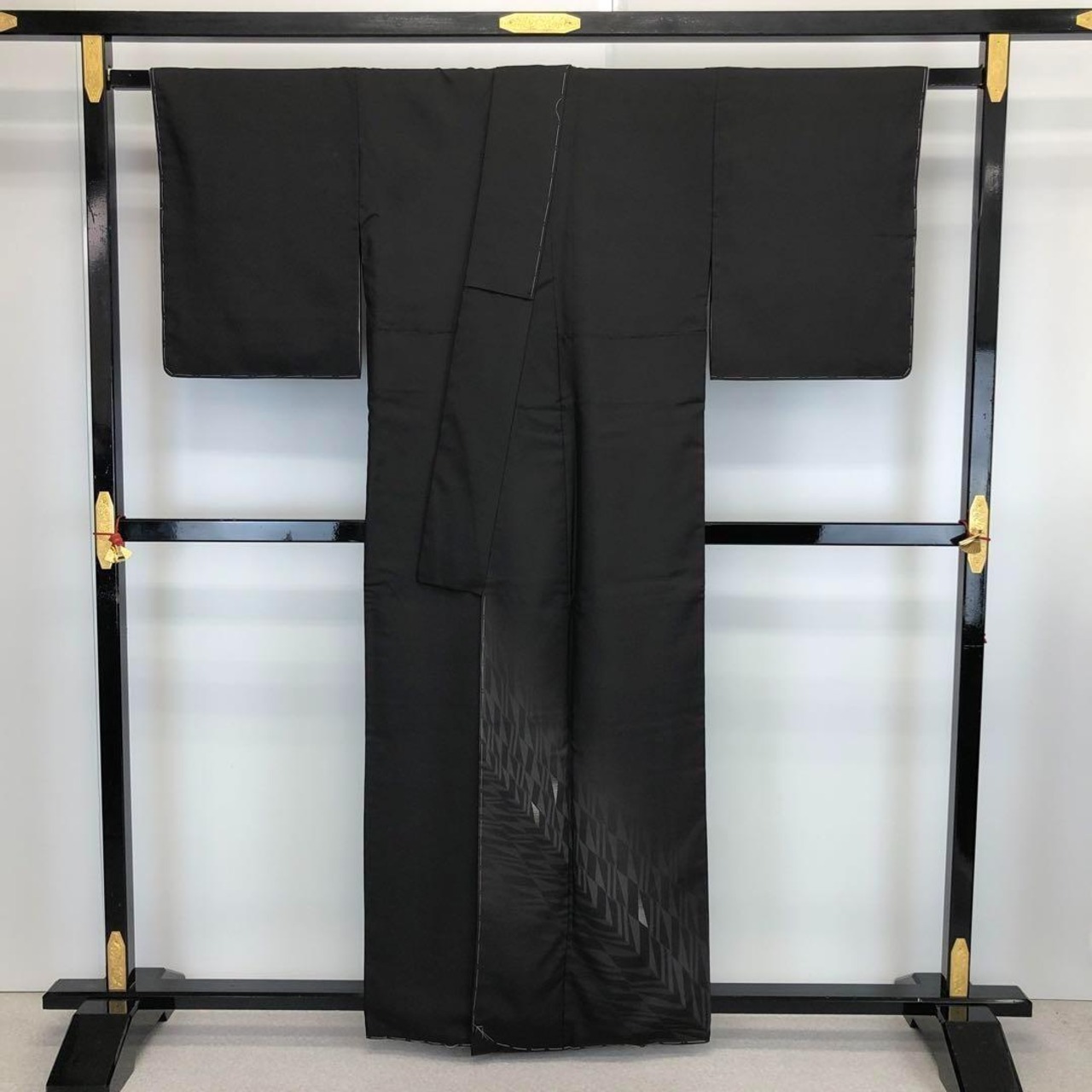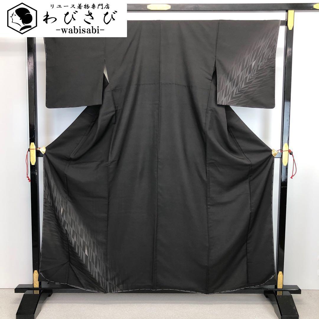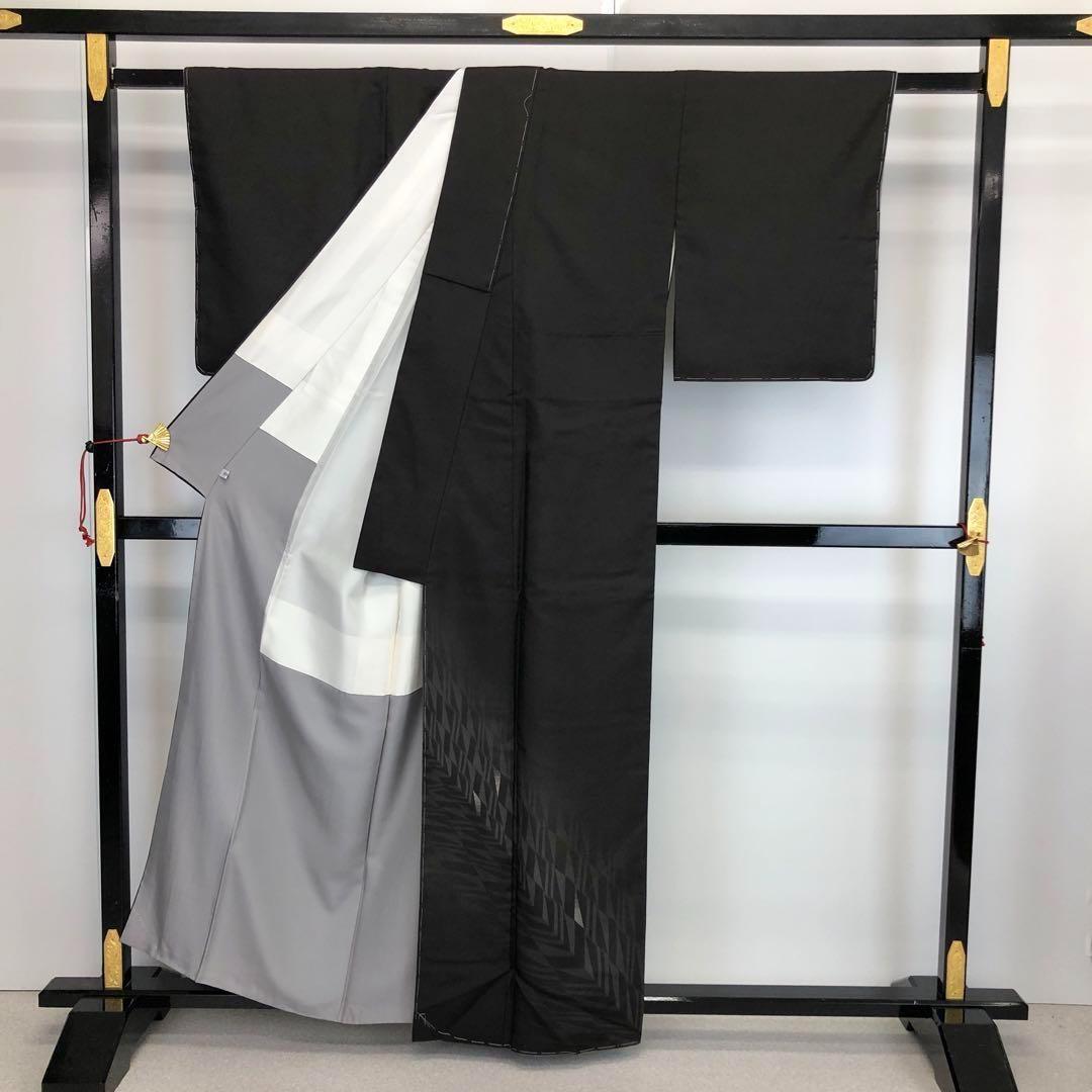 黒鼠色のシックなお色味に一部刺繍が使われたモダンな幾何学模様がデザインされたスタイリッシュな柄裄のお品でございます。
