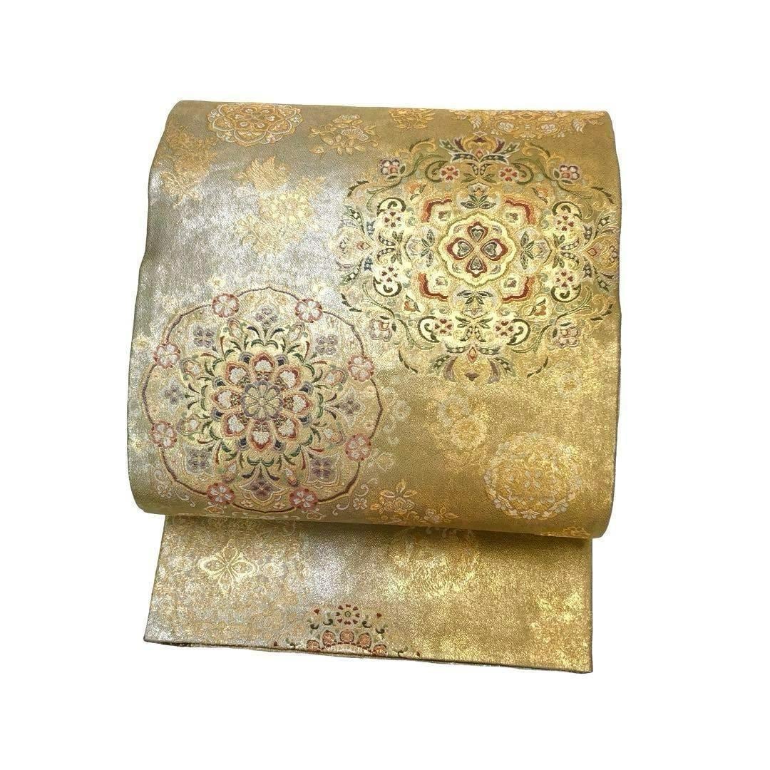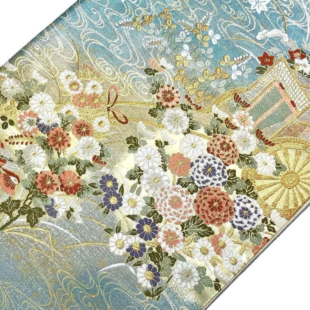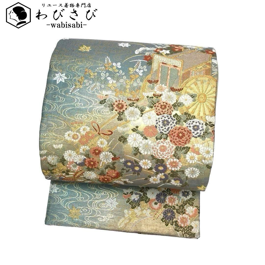 袋帯 リバーシブル 曲水源氏車文 鏡裏華文 美しい花模様 鴛鴦 O-3545 着物 きもの kimono 和服 和装 中古 リサイクル着物 【送料無料】
