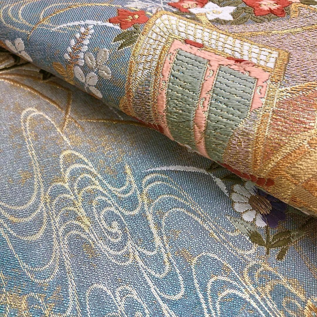 曲水源氏車文、鏡裏華文と題された美しい四季の花模様、御所車、鴛鴦、反対は金銀色ベースの煌びやかな華柄模様がデザインされた両面お使い頂ける素敵な柄裄のお品でございます。