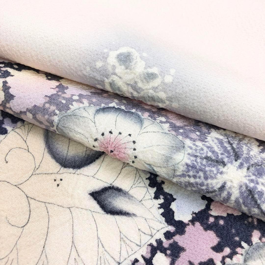 乙女色の淡い桃色のお色味に色使いの良い美しい辻が花絞りがデザインされた素敵な柄裄のお品でございます。