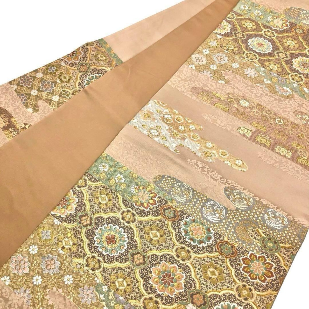 袋帯 エ霞に煌びやかで美しい華柄模様 金糸 丁字茶色 O-3561