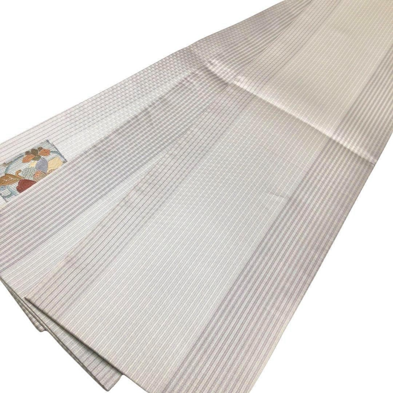 袋帯 四角の中に花唐草模様 刺繍柄 縞模様 雲井鼠色 O-3555