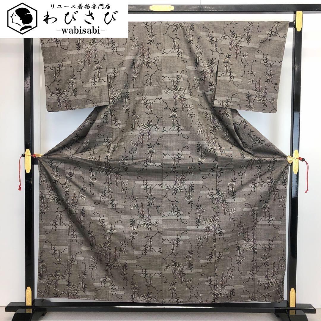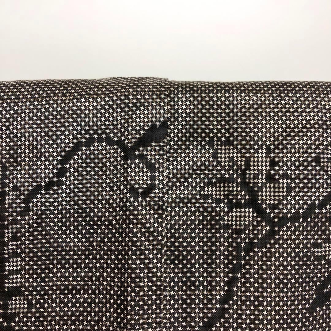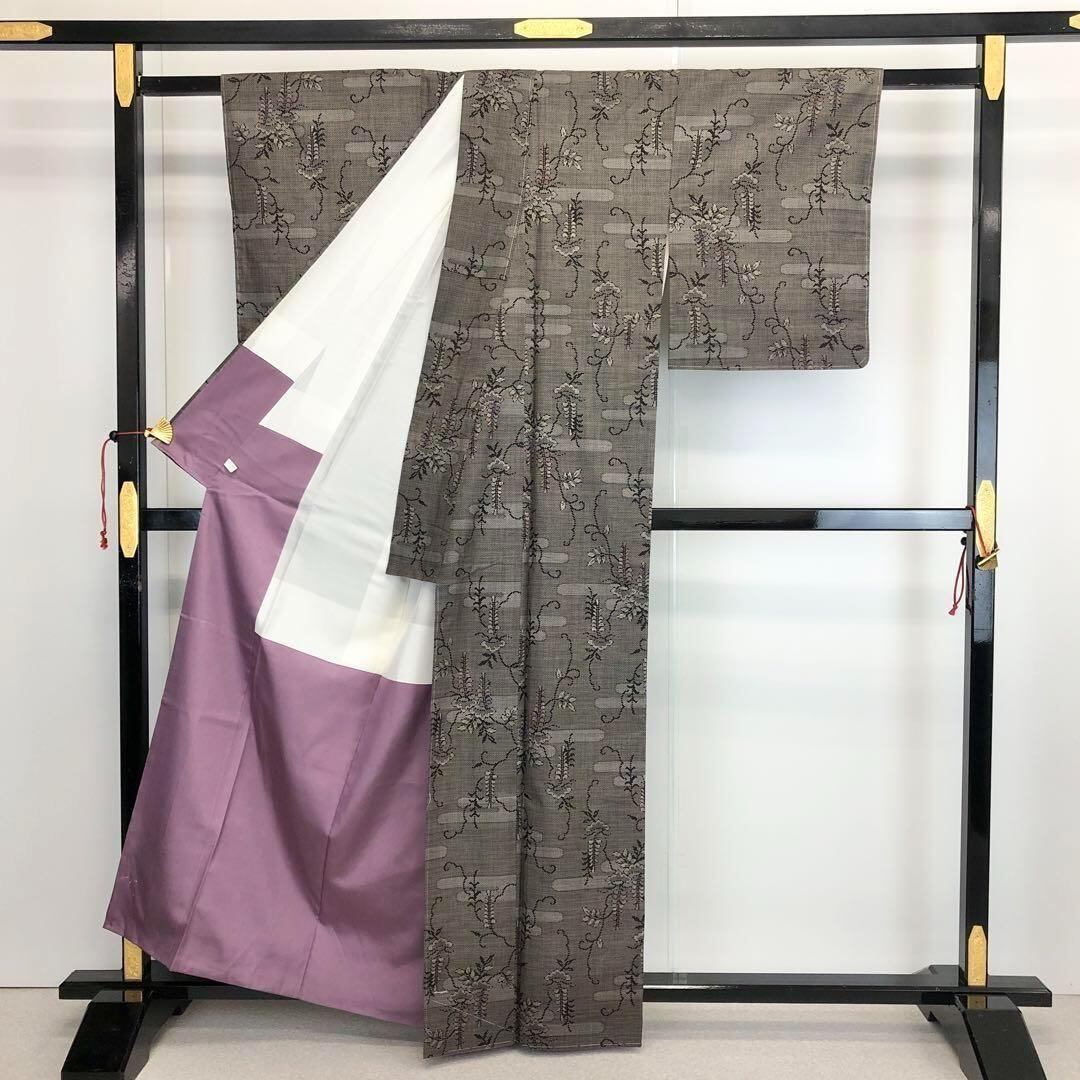 雰囲気の良い茶泥染のお色味にエ霞、松に藤の花模様がデザインされた素敵な柄裄のお品でございます。