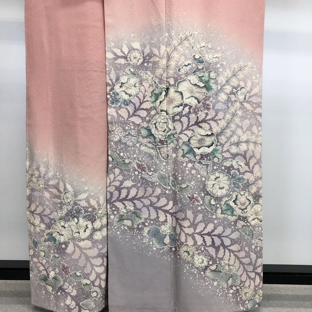 長春色の上品なお色味の縮緬に暈し、美しい辻が花絞りの柄裄がデザインされた素敵な柄裄のお品でございます。