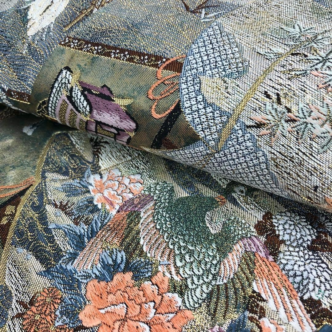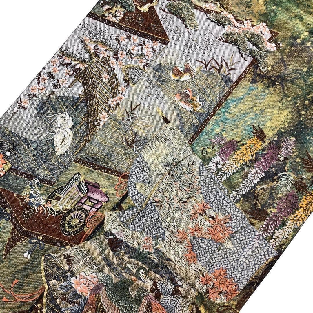 袋帯 春の宴 銀銹錦 花鳥柄 風景柄 御所車 松 藤の花 金糸 O-3573