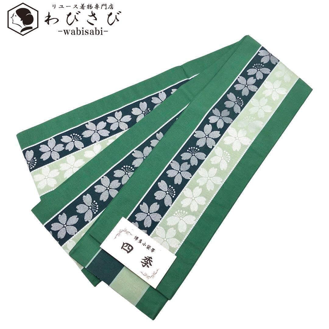 半幅帯 本場筑前博多織 リバーシブル 縦柄桜の花模様 緑茶色 O-3588