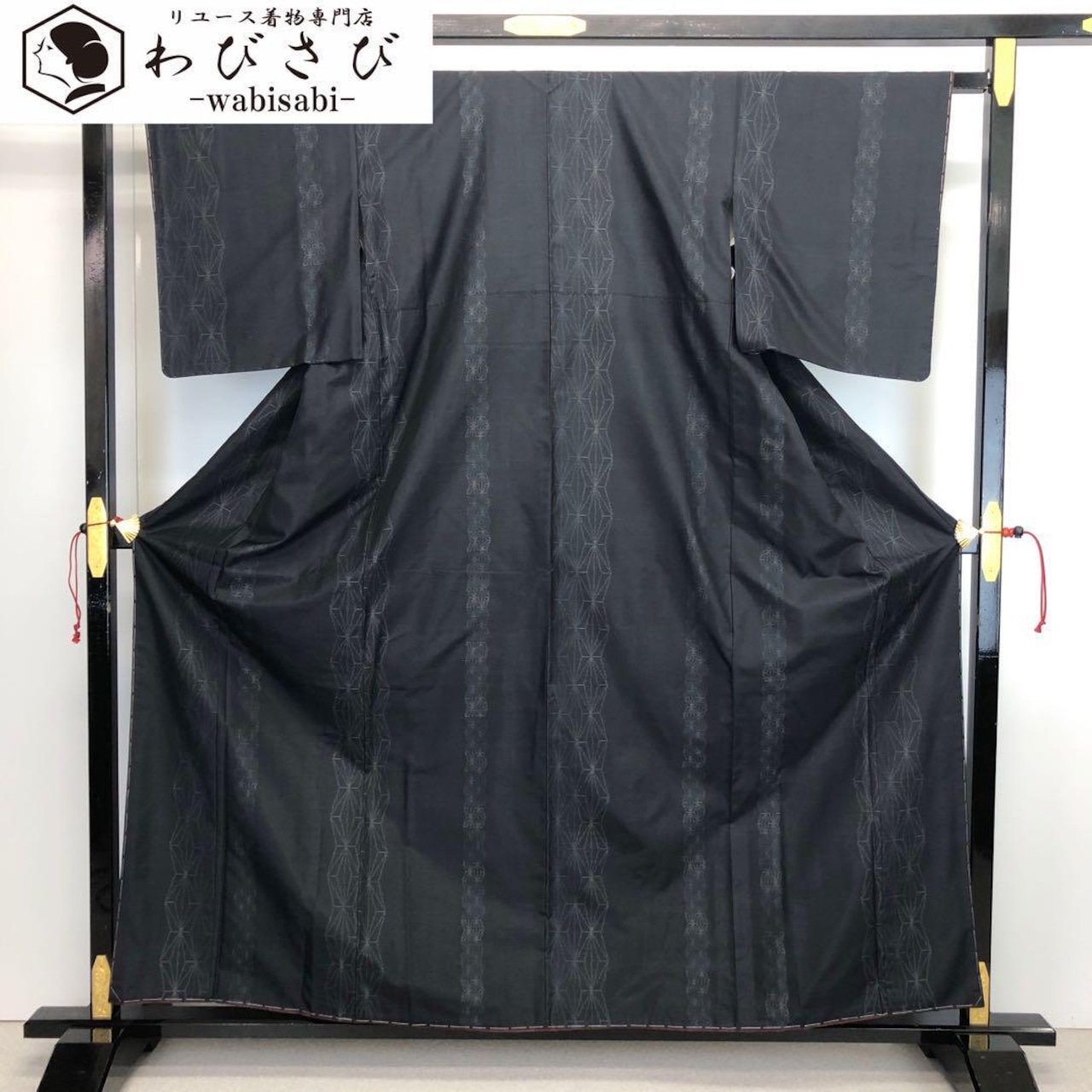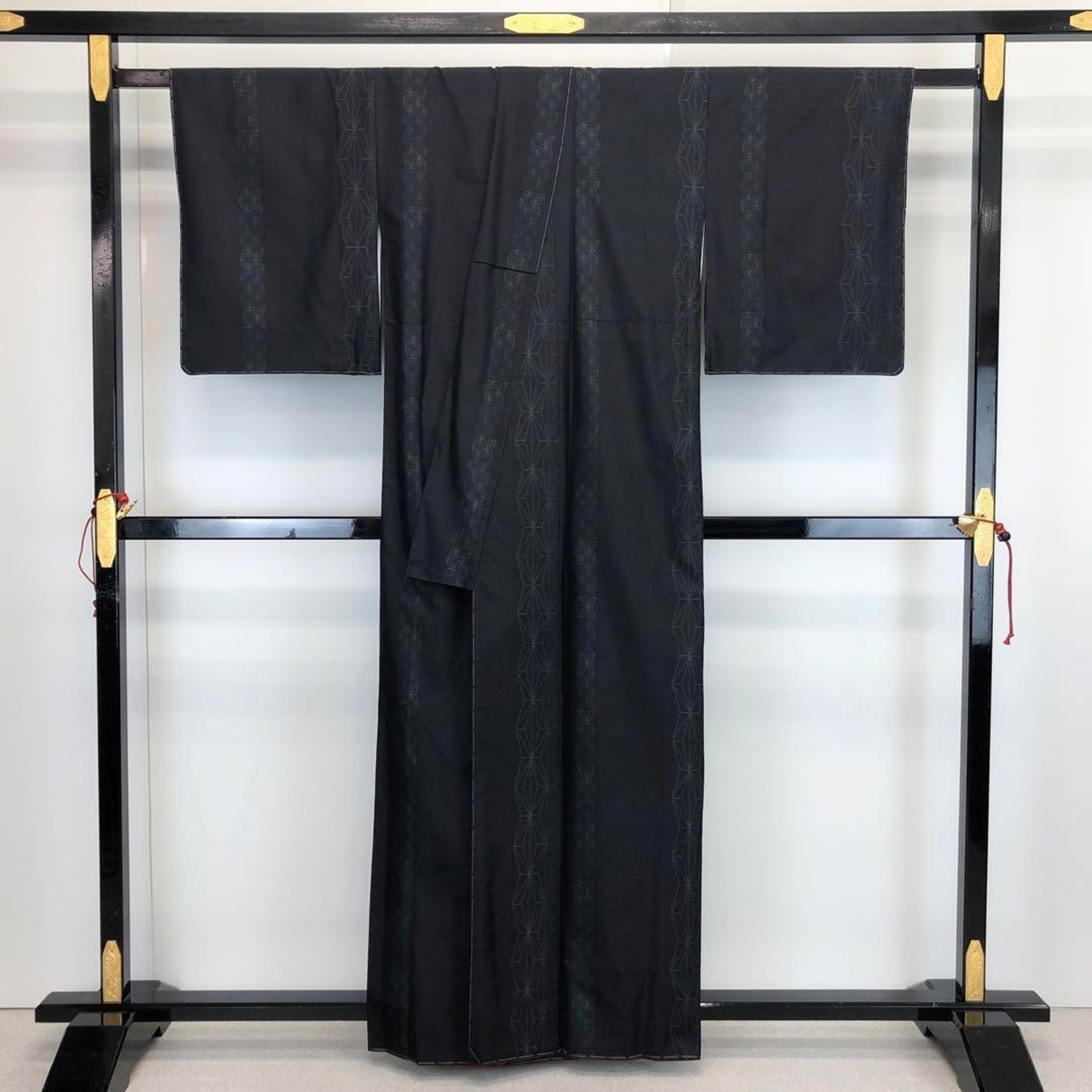 黒色ベースのお色味に大小縦柄にデザインされた麻の葉模様が素敵なお品でございます。