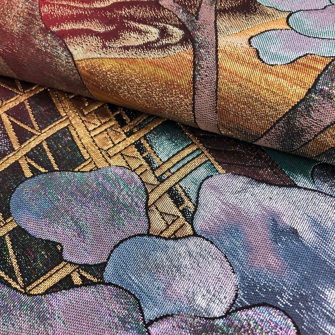 オーロラ箔が使われた風景柄、橋桁に松模様の柄裄がデザインされた素敵なお品でございます。