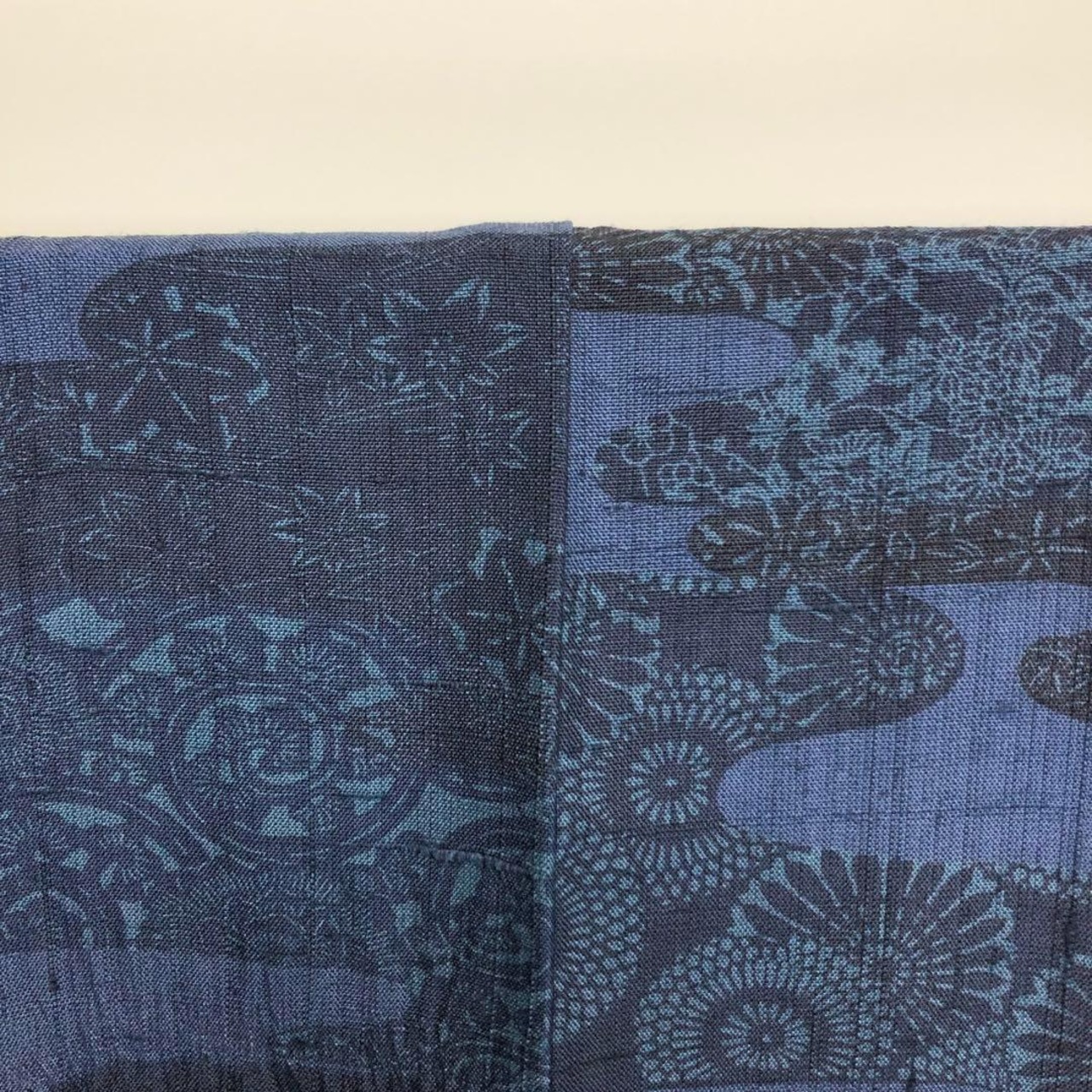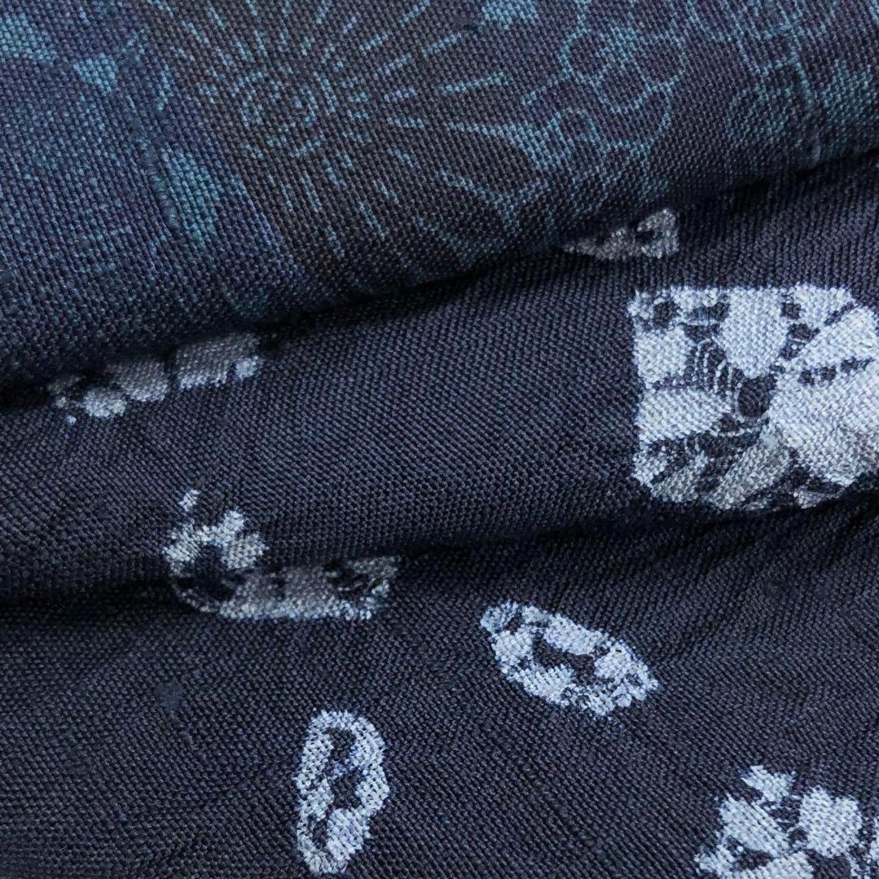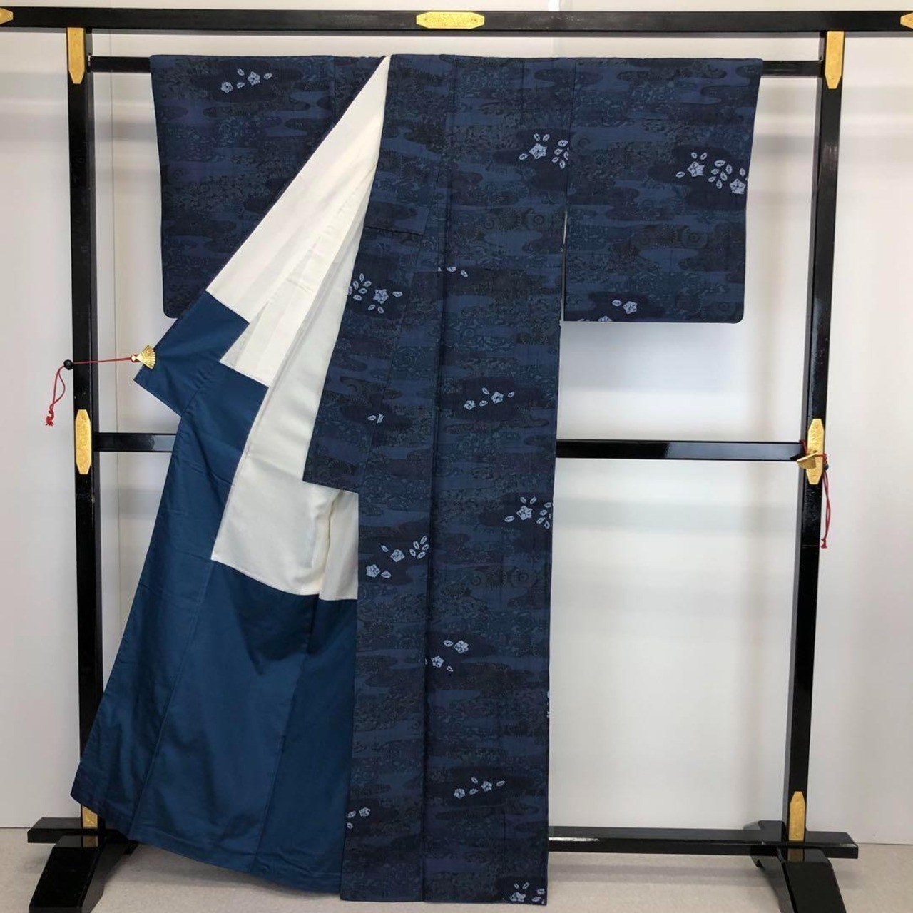 紬着物 藍染絞り 雰囲気の良い型染 霞に花唐草 K-3629