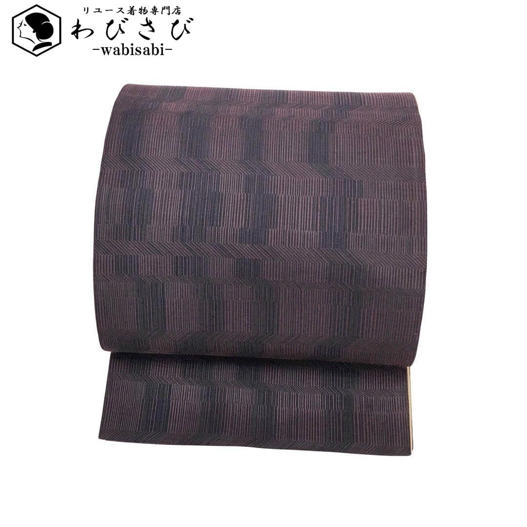 袋帯 リバーシブル 幾何学織模様 縦線模様 紫烏色 支子色 O-3577 着物 きもの kimono 和服 和装 中古 リサイクル着物 【送料無料】