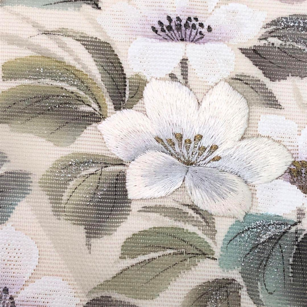 夏帯 袋帯 絽 旭峯 刺繍 手描き 竹柄に上品な白花 ラメ 乳白色 O-3567