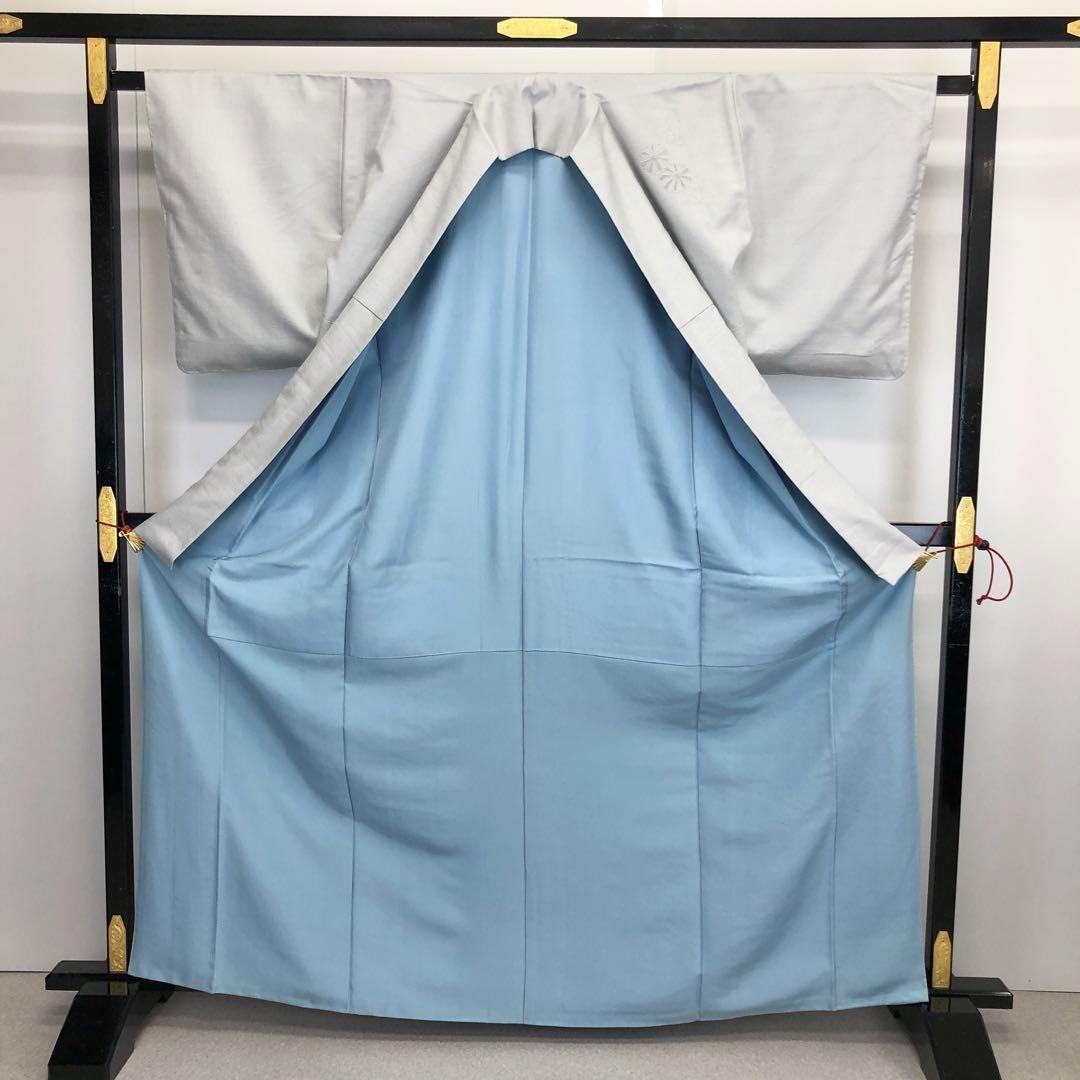 付下げ 総刺繍 汕頭刺繍 波模様花七宝 真綿紬 薄京鼠色 しつけ糸 K-3643