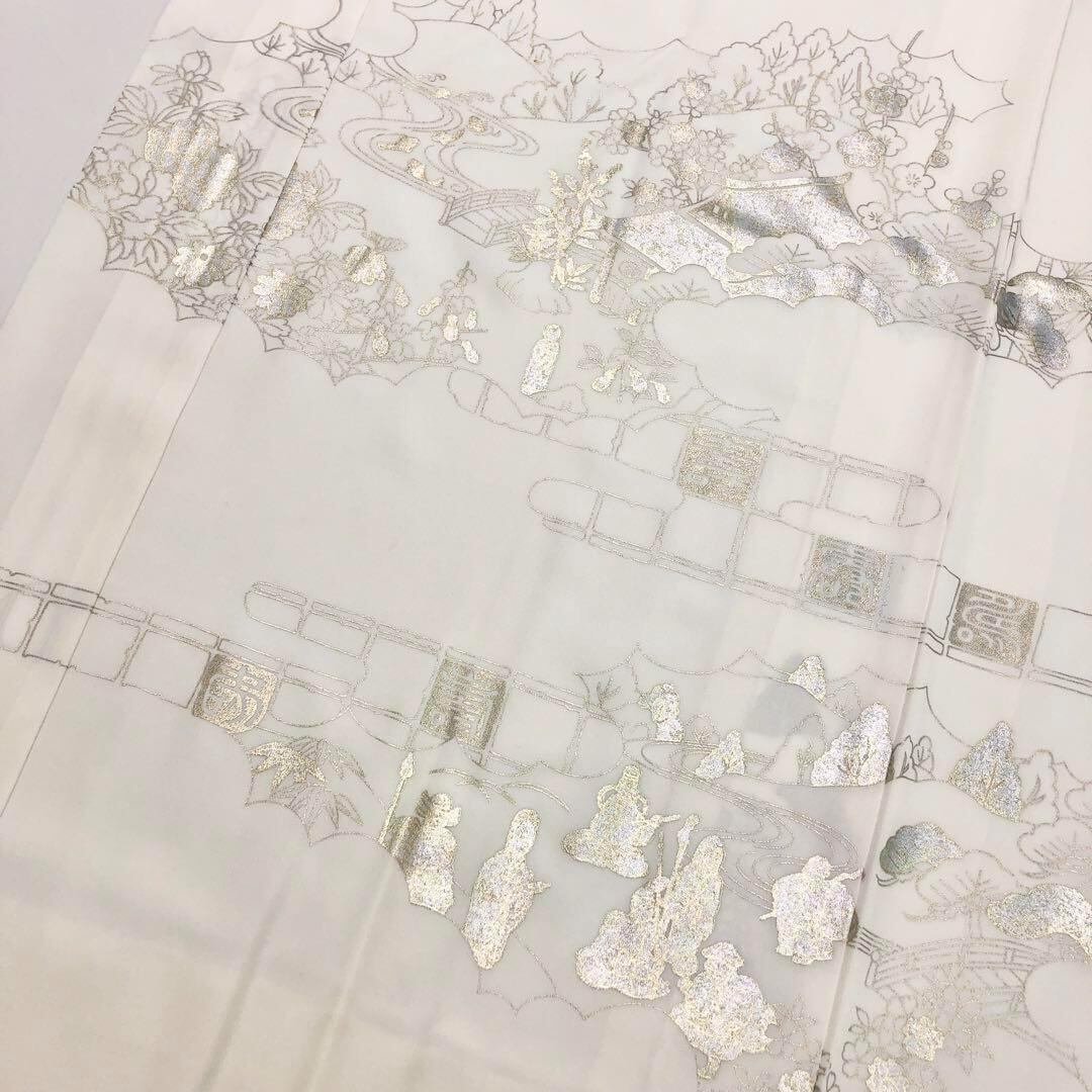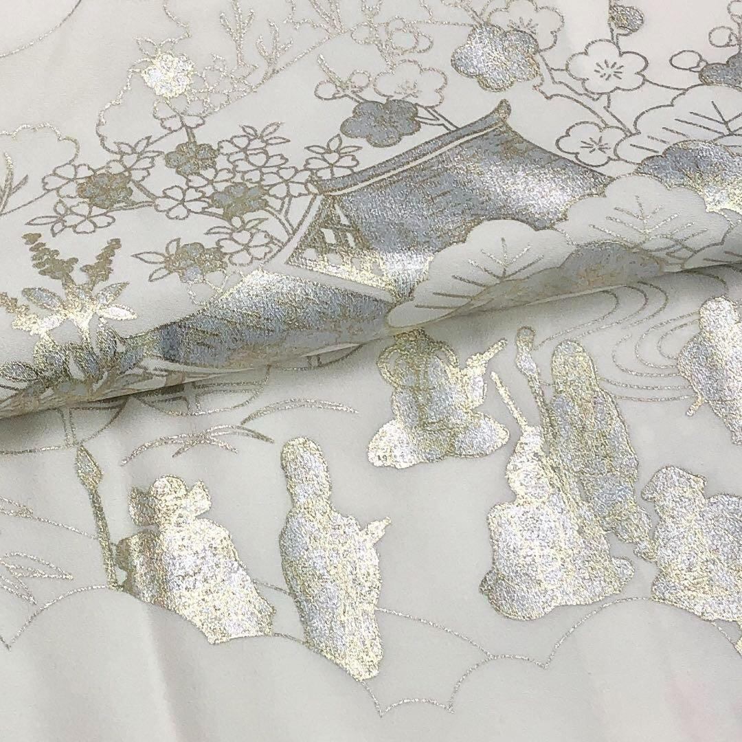 乳白色の上品なお色味に金銀彩の煌びやかなお色の七福神、風景、花柄模様がデザインされた素敵な柄裄のお品でございます。