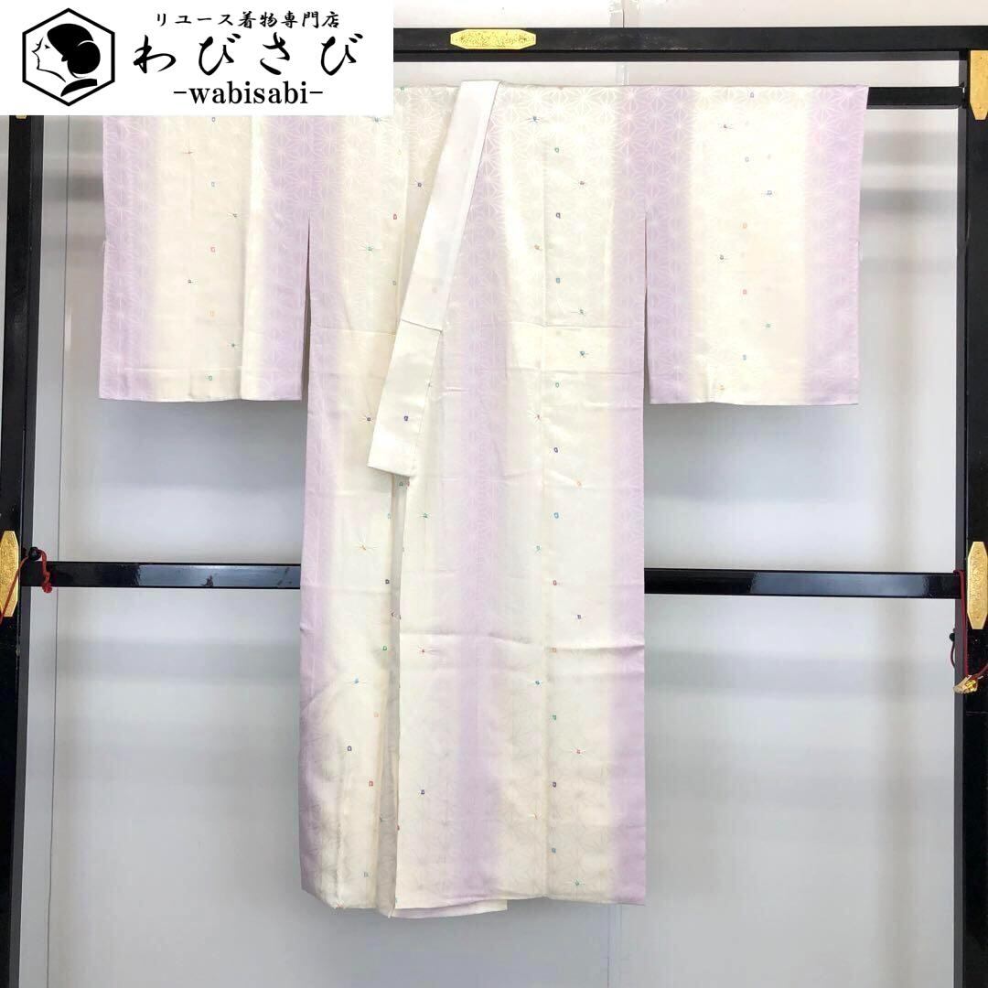 乳白色の品のあるお色味に暈し、麻の葉模様に小さな絞り柄のデザインが可愛らしい素敵な柄裄のお品でございます。