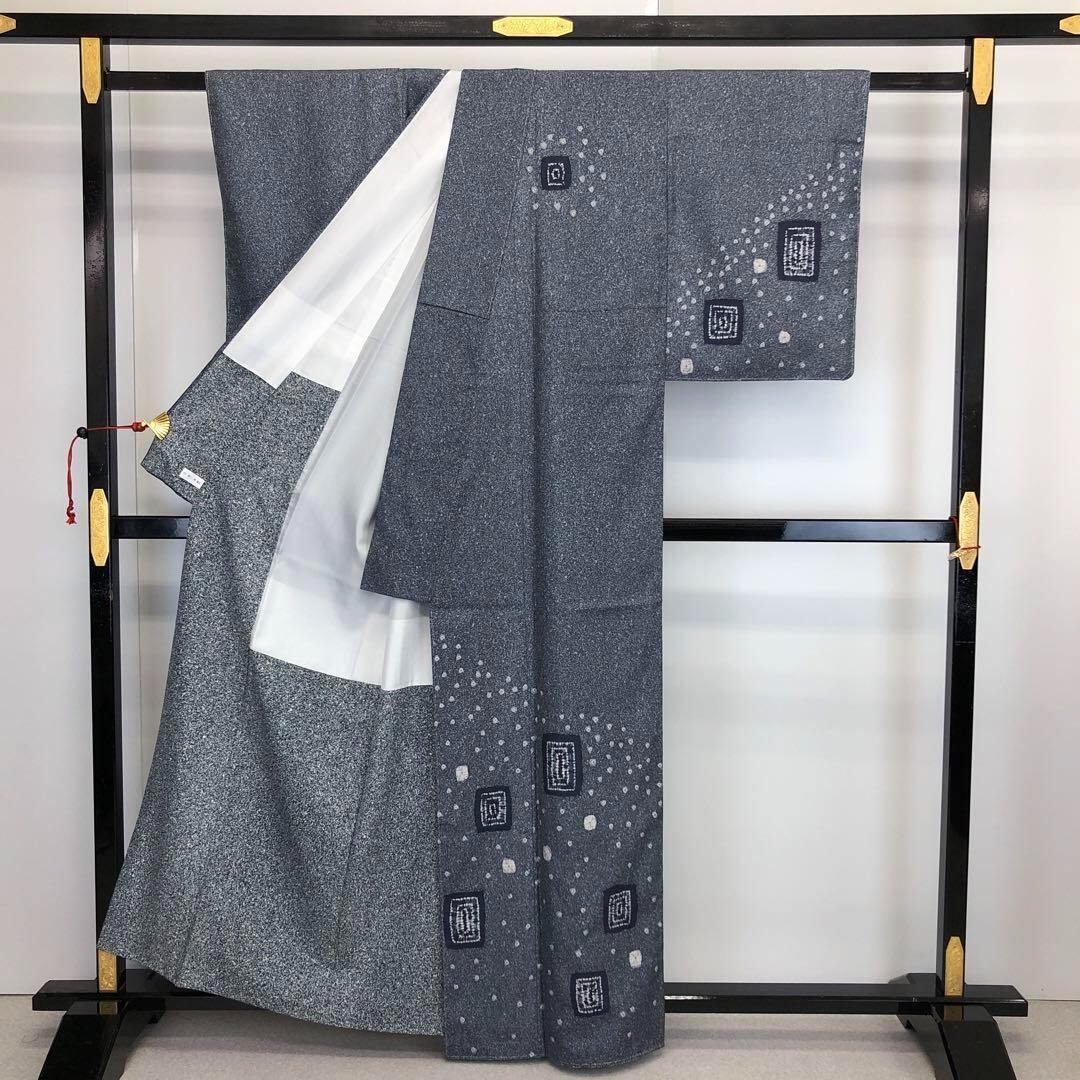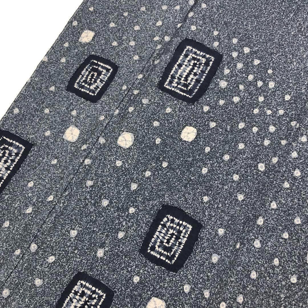 藍錆色の藍染に叩き染、絞りの四角模様などの柄裄がデザインされた素敵な柄裄のお品でございます。