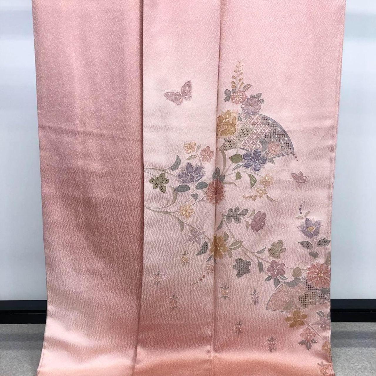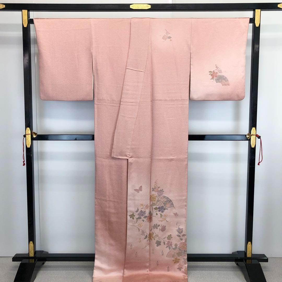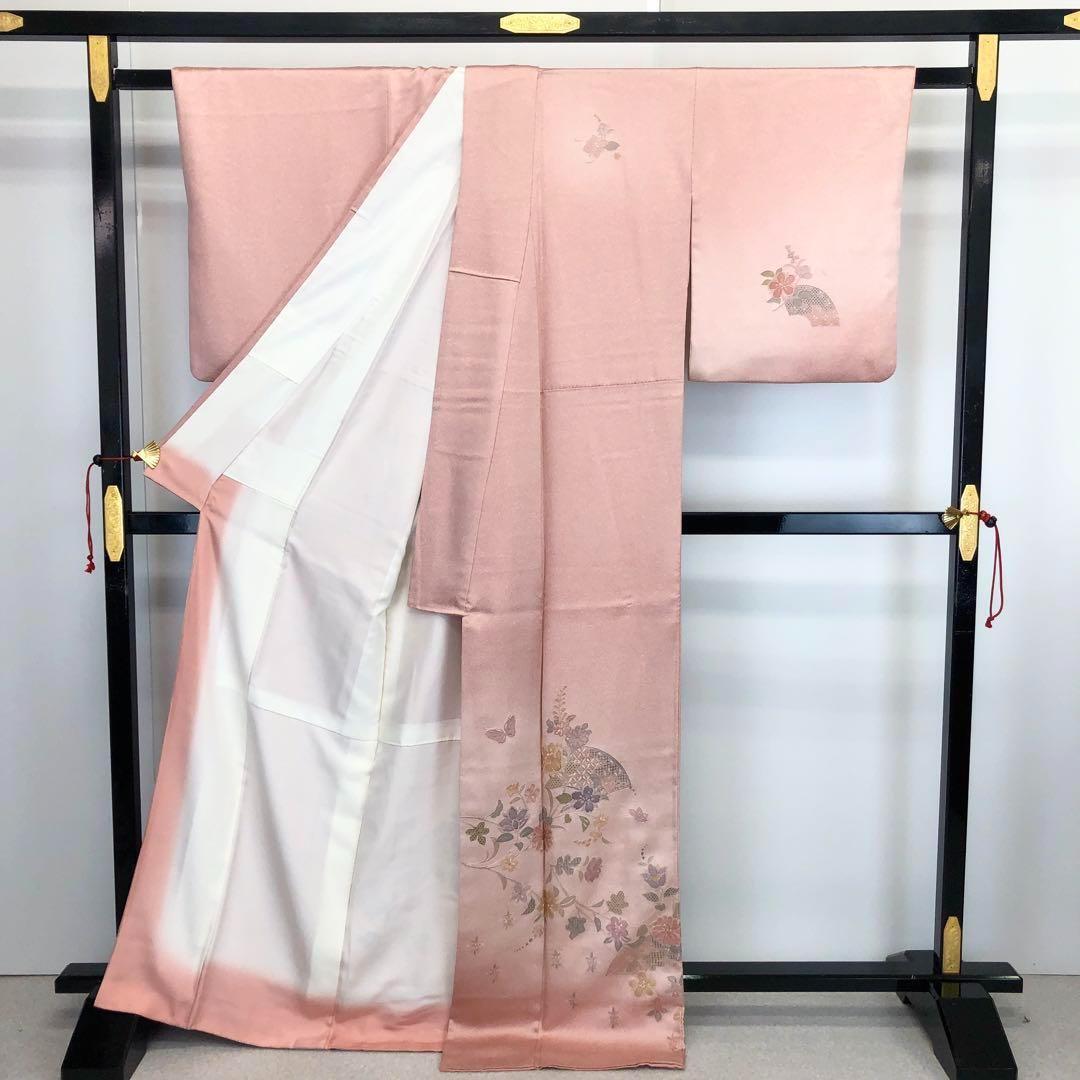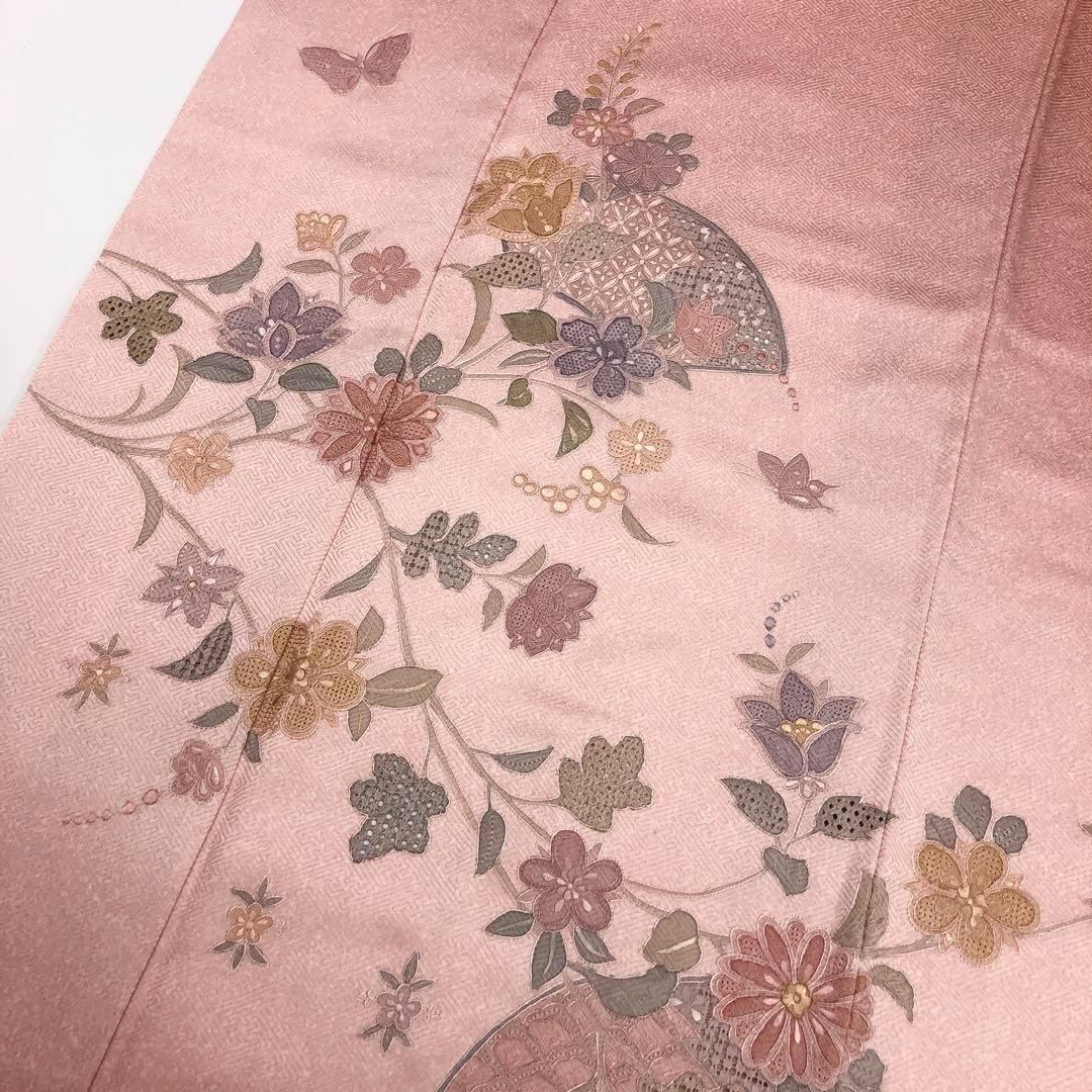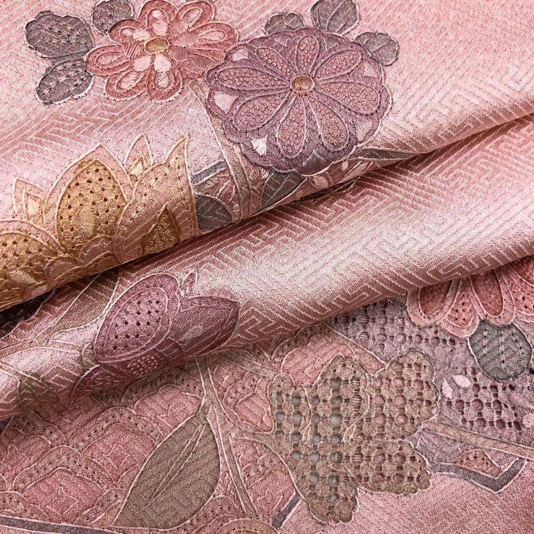 曙色の品のある桃色に汕頭刺繍、相良刺繍でデザインされた素敵な柄裄のお品でございます。