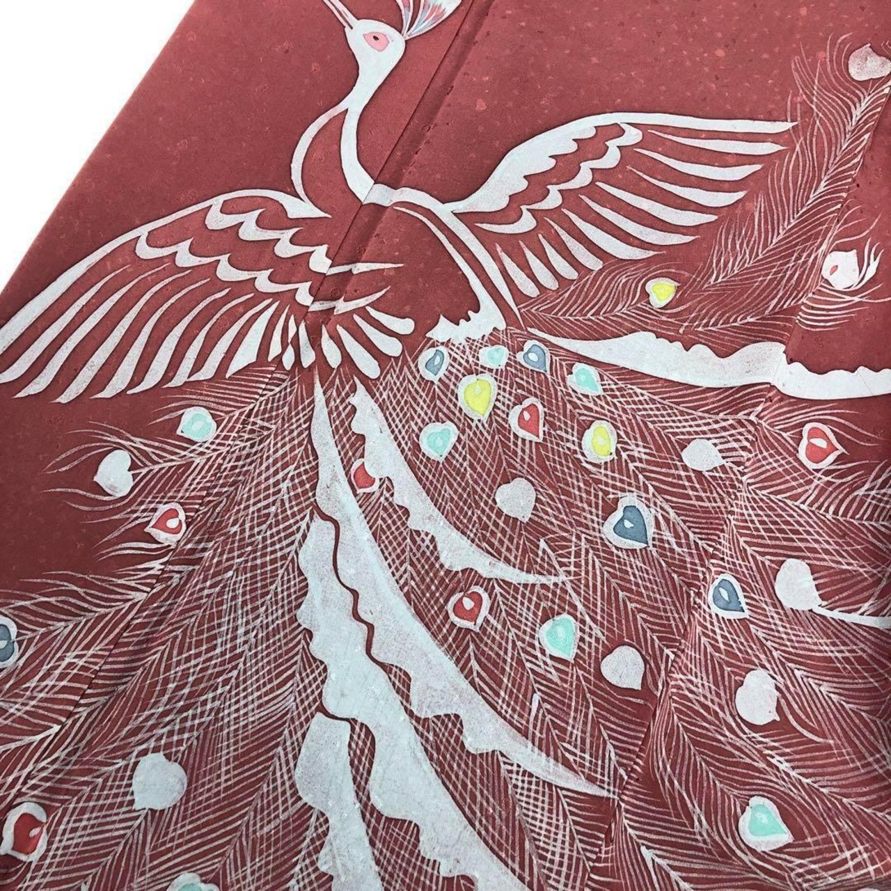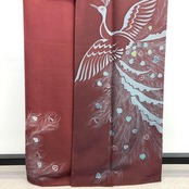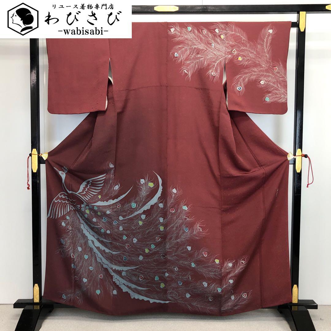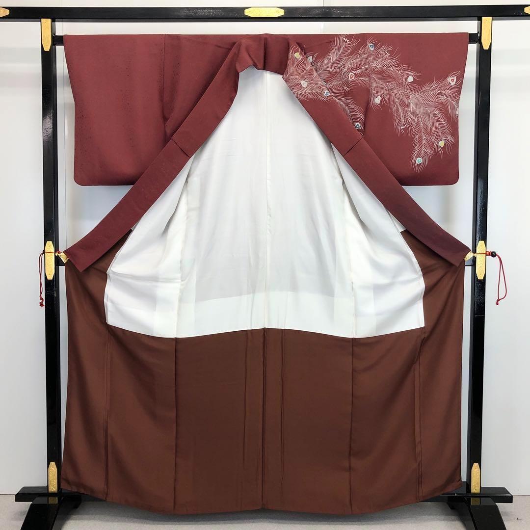 深蘇芳色の落ち着きのあるお色味に暈し、羽ばたく孔雀の美しい羽根柄模様がデザインされた素敵な柄裄のお品でございます。