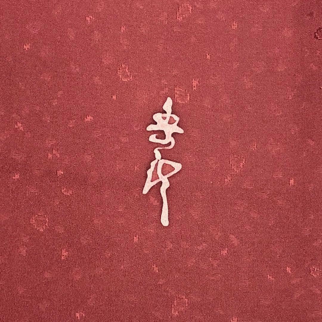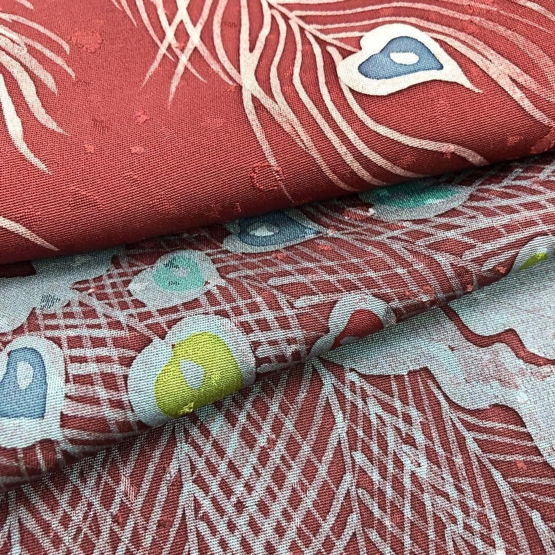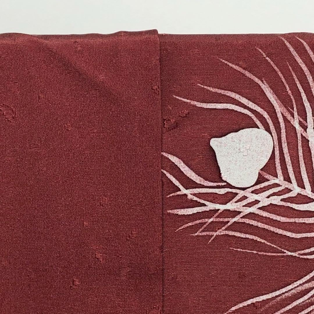 深蘇芳色の落ち着きのあるお色味に暈し、羽ばたく孔雀の美しい羽根柄模様がデザインされた素敵な柄裄のお品でございます。
