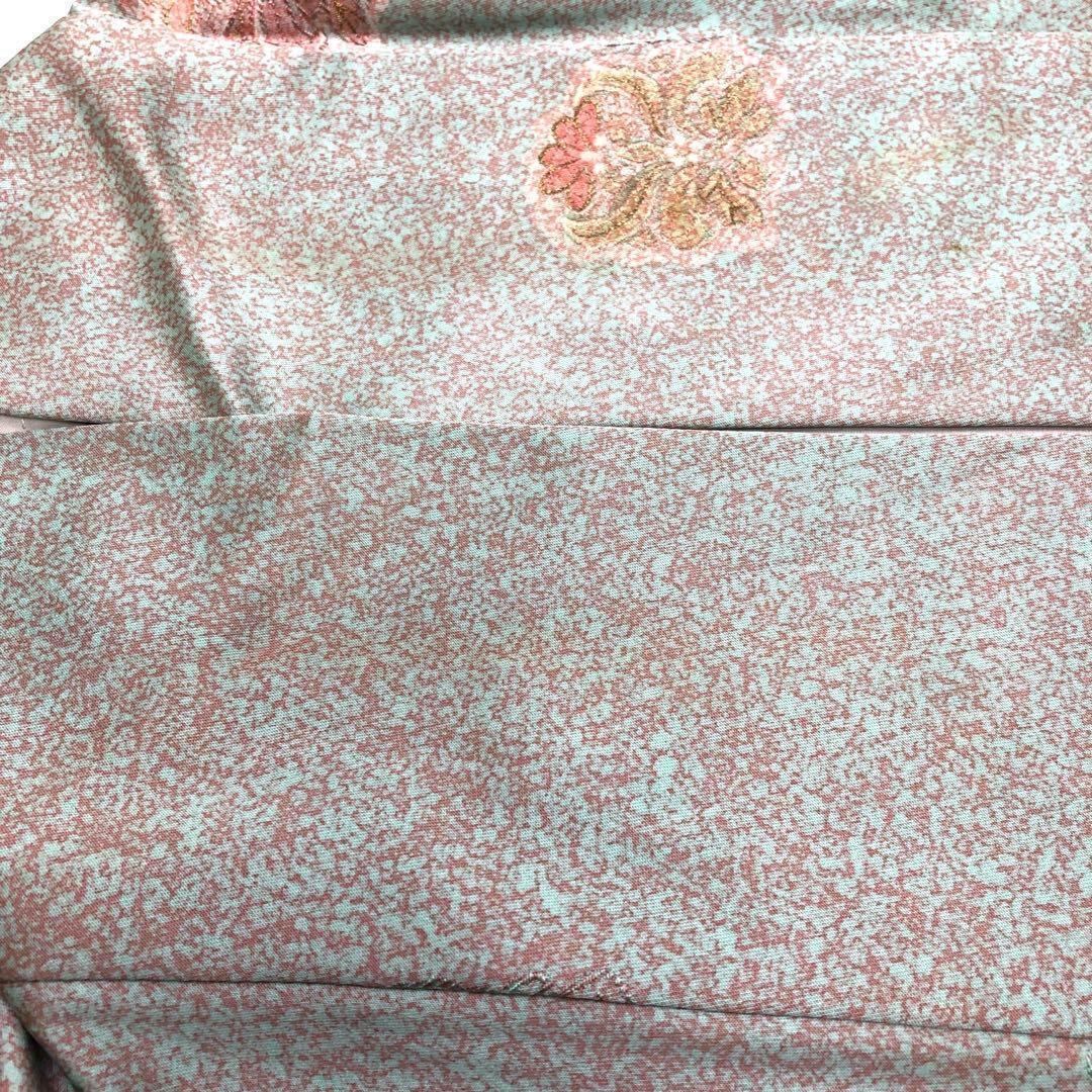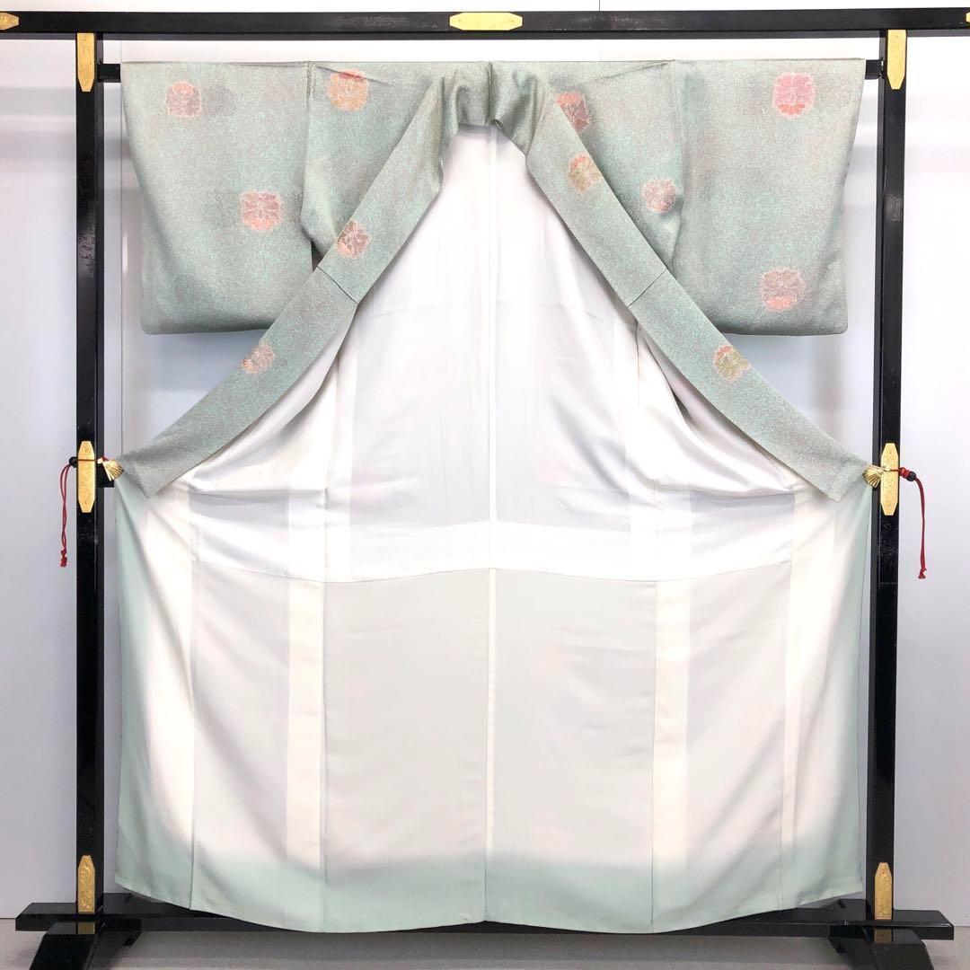 裏葉色の品のあるお色味に叩き染、飛び柄の花模様がデザインされた素敵な柄裄のお品でございます。