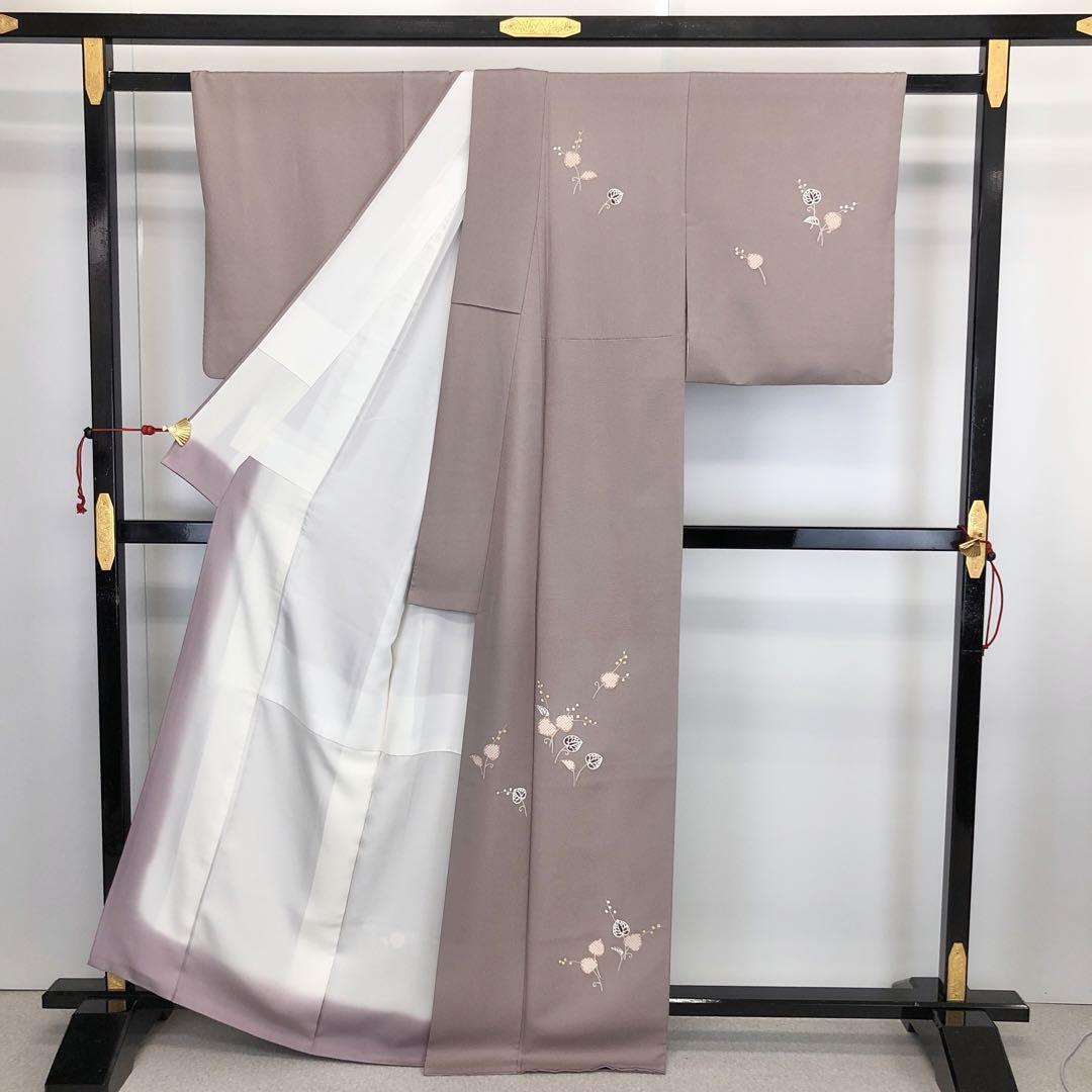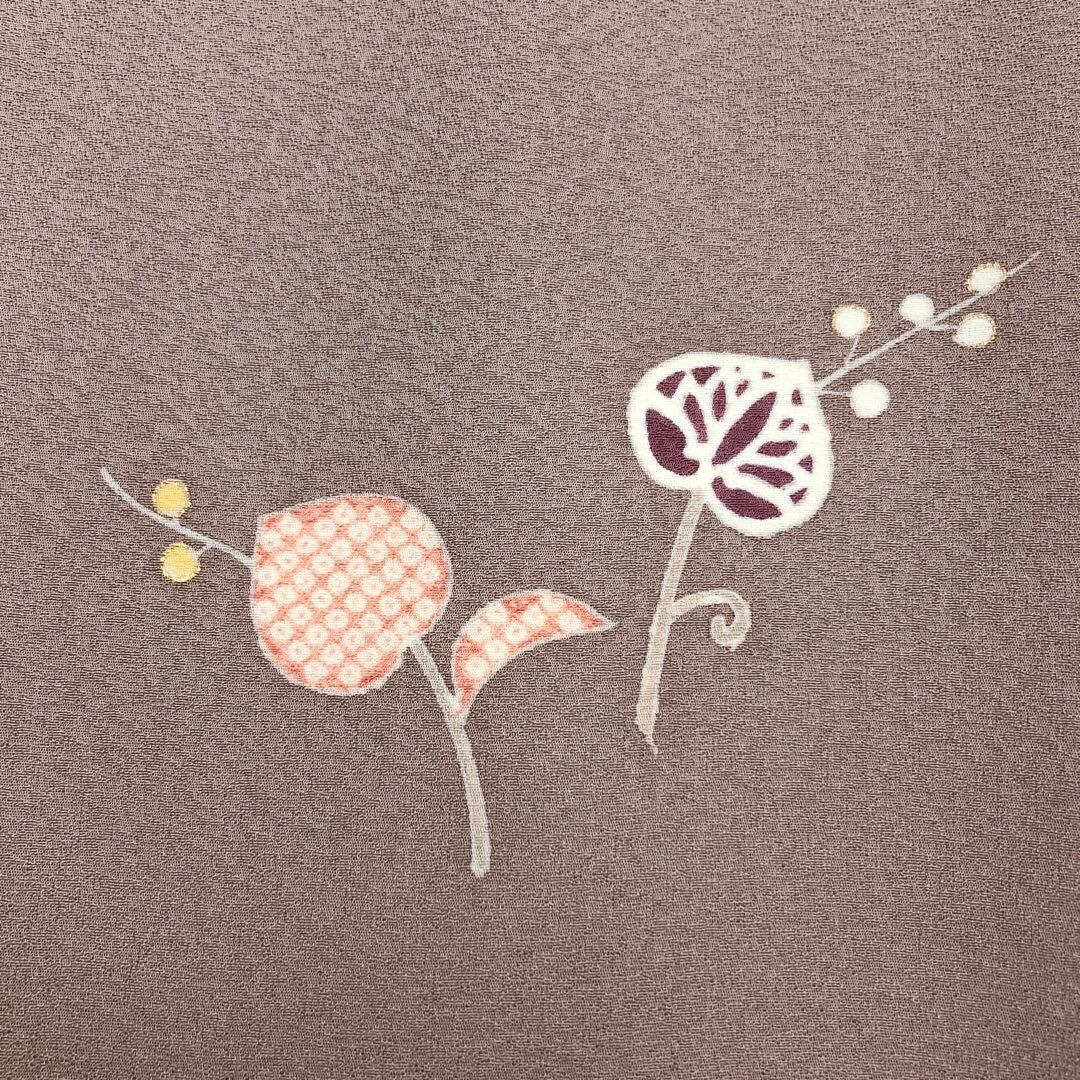 梅鼠色の落ち着きのあるお色味の縮緬、草花模様に鹿の子模様がデザインされた素敵な柄裄のお品でございます。