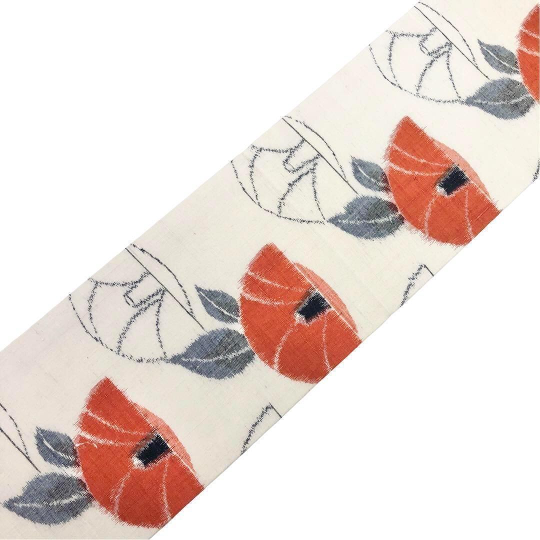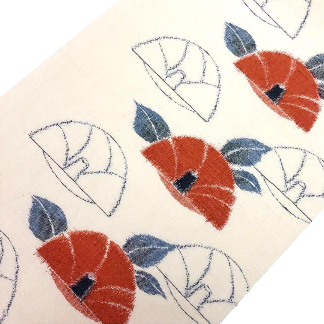 名古屋帯 椿の花 抽象柄模様 紬 乳白色 O-3600
